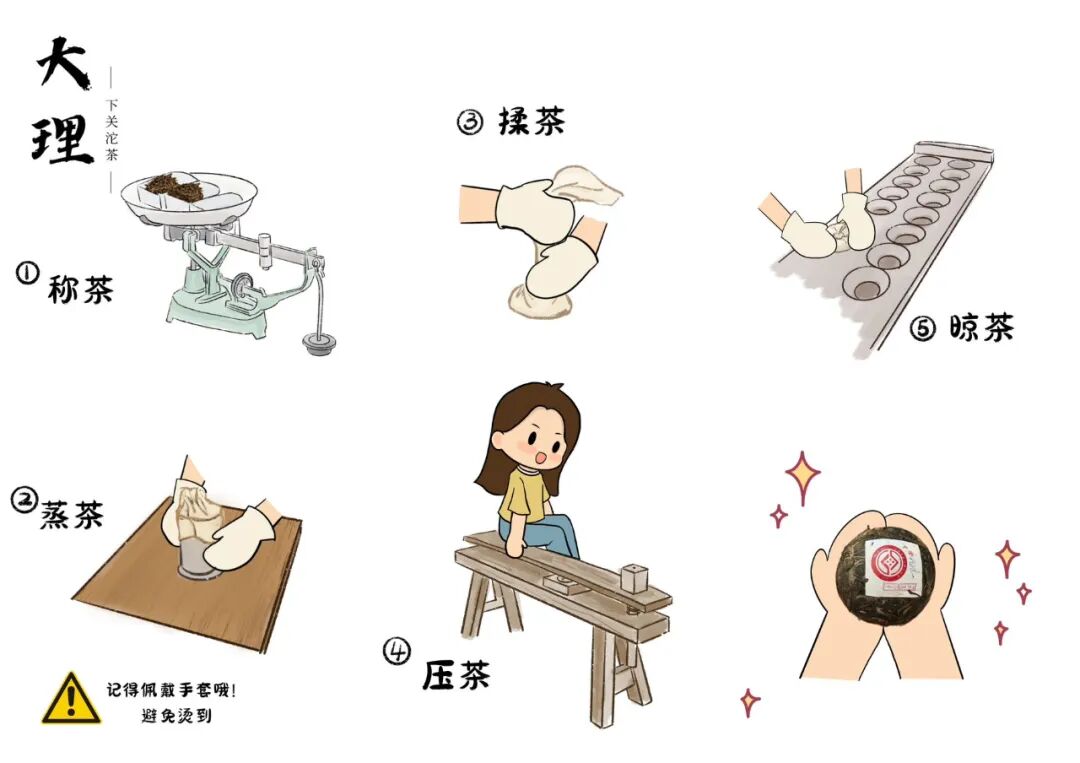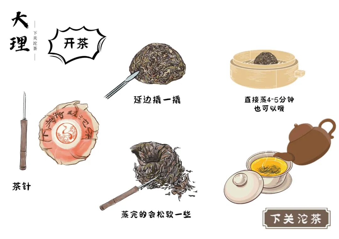 1902年,下关茶商在“姑娘团茶(女儿茶)”的基础上进行改良,创新推出外形呈碗臼状的砣茶。而后因其畅销于四川沱江一带,使“沱江水泡下关茶”的说法广为流传,“砣茶”便逐渐演变为“沱茶”。下关沱茶以云南大叶种晒青茶作为基础原料,经过筛分、拣剔、拼配、称量、蒸揉、压制成型、干燥等多个环节、多道工序制作而成。拼配、称量,一般是指采用不同原产地、不同风味、甚至不同年份的茶叶,按照配方进行配比和加工;蒸揉,是利用水蒸气软化茶叶,软化后倒入布袋中,用力紧实茶叶;压制成型,是利用双手和工具,使沱茶呈紧压形态。传统的沱茶压制方法经历了从铅饼、石墩压制到压茶凳压制的不同阶段;脱袋、干燥,把压制好的茶叶从布袋中取出,置于木框上晾干。沱茶外形与普通茶不同,从上面看像“圆面包”,从底部看又类似厚壁碗,中间下凹。喝下关沱茶,要先将沱茶掰成碎块,取3克左右,冲泡5分钟即可饮用;也可放入瓦罐,用火烤香后加入沸水冲泡饮用。在这一杯下关沱茶里,静享时光的流淌,品味生活的真味,让心灵暂栖茶韵之中,得片刻悠然……