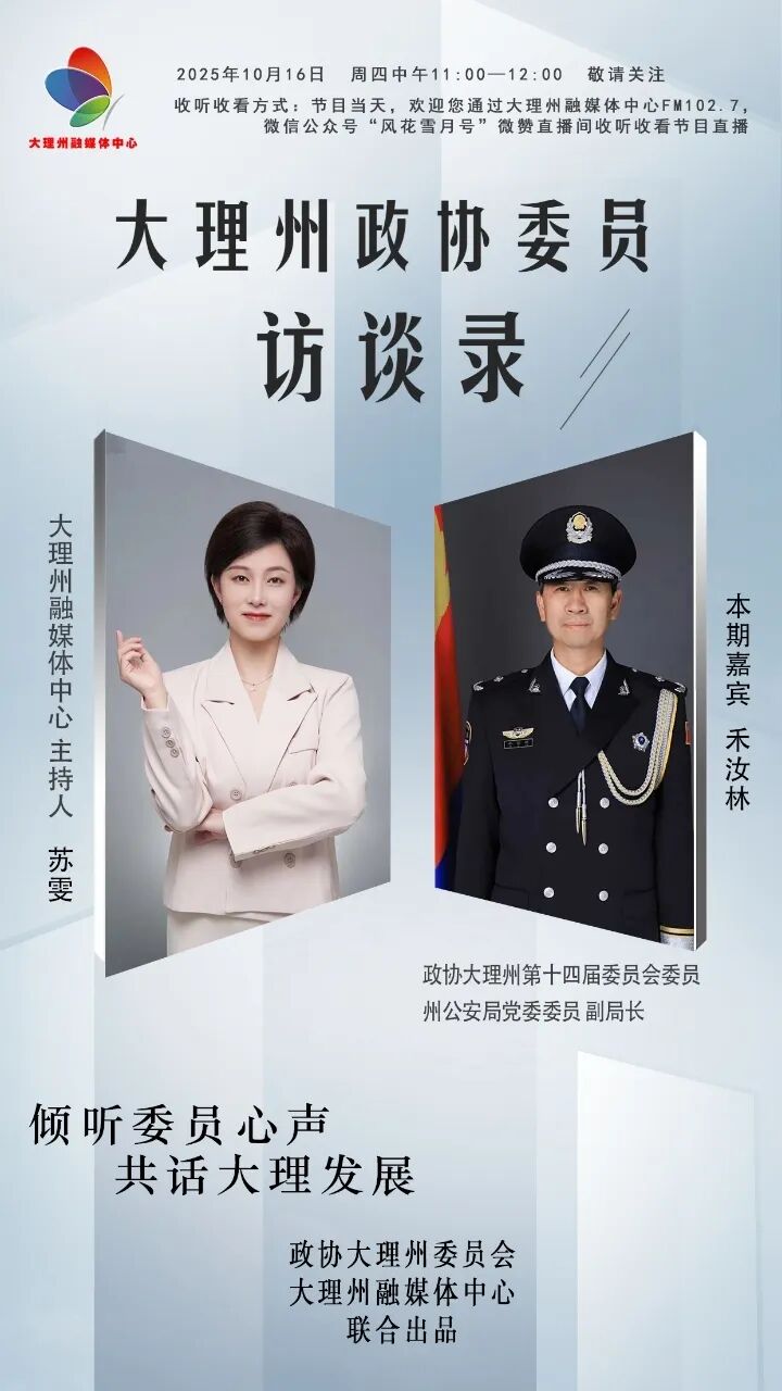 10月16日上午11点至12点,第147期《大理州政协委员访谈录》邀请政协大理州第十四届委员会委员,大理州公安局党委委员、副局长禾汝林,与大家一起探讨交流。