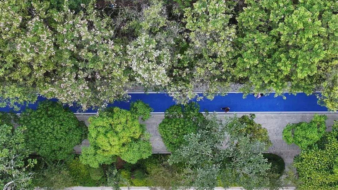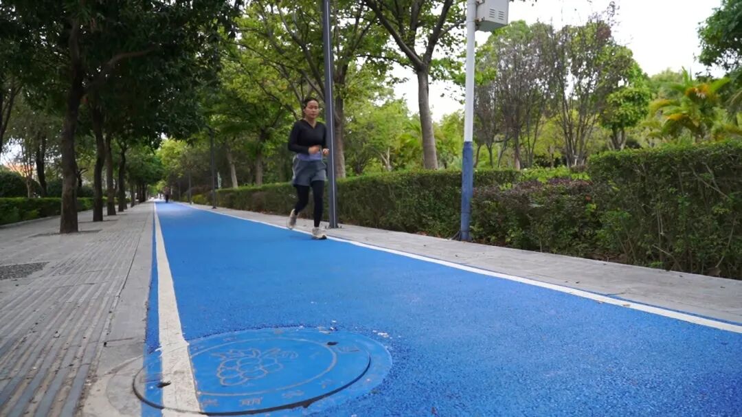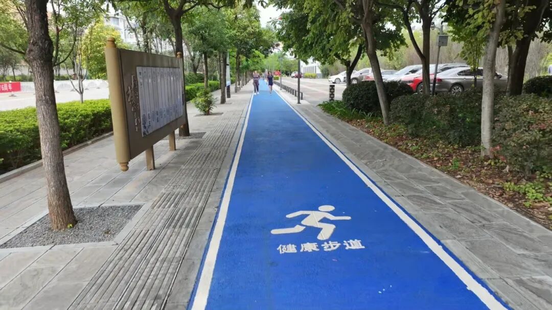 更暖心的是步道的细节设计:累了,路边有坐凳可以随时休息;盲道与步道并存,无论是散步、慢跑还是骑行,不同需求的人都能安心使用。步道还串联起明德公园、至善公园和行政中心,上班族午休时可以来走走,居民晚饭后带着家人遛弯,周末带孩子来活动,都非常方便。