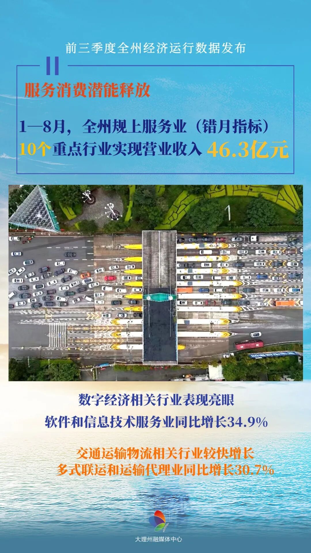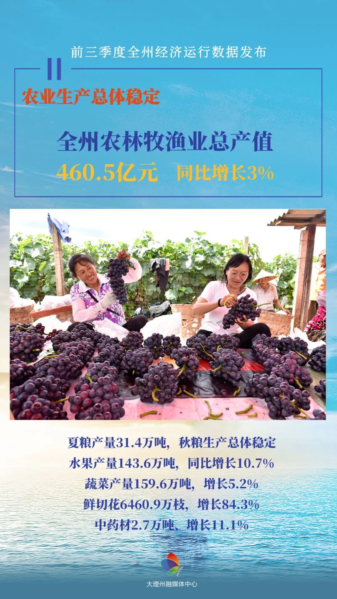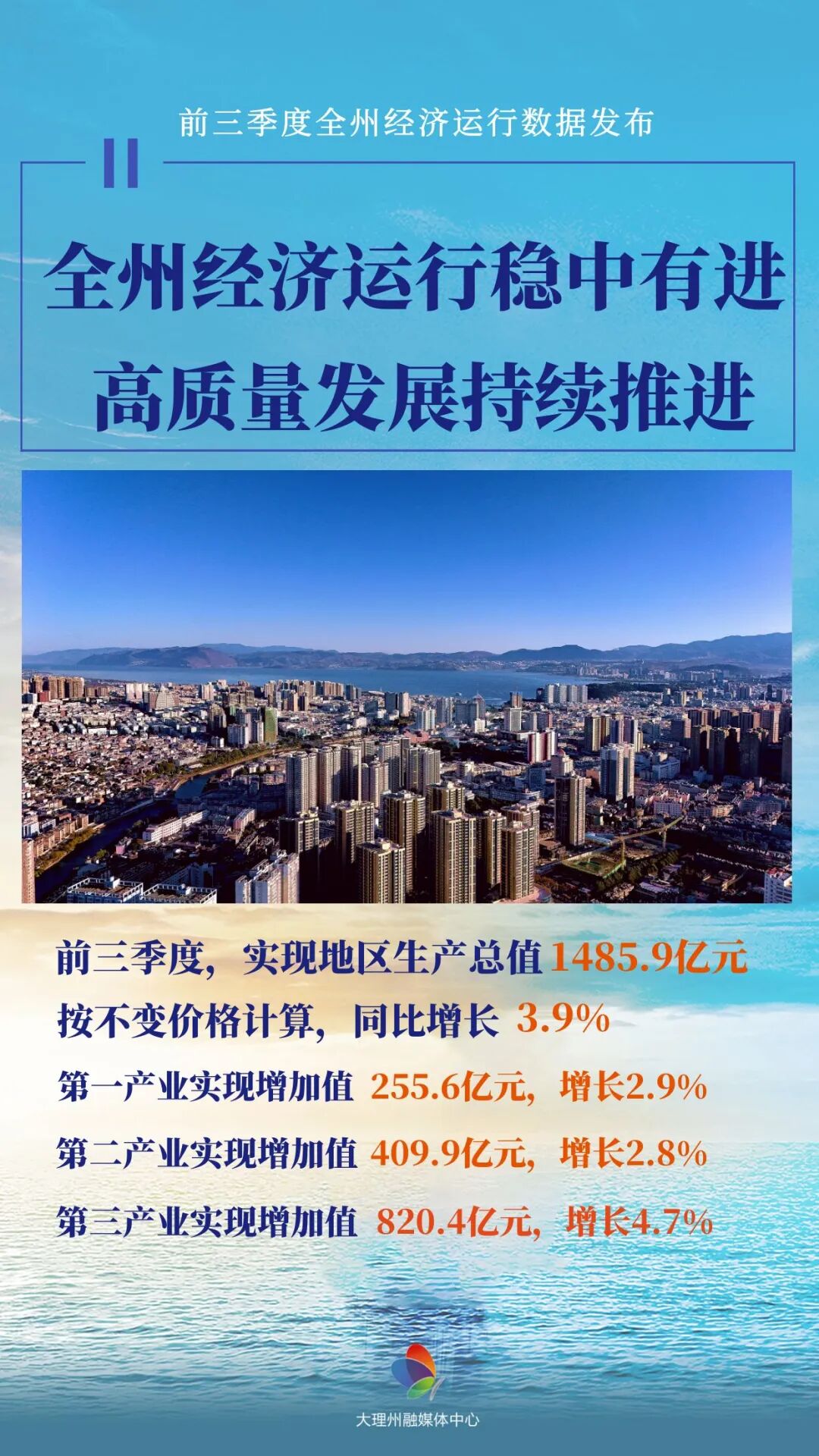 10月23日,州统计局和国家统计局大理调查队发布今年前三季度全州经济运行情况。总体看,随着稳经济系列政策举措接续发力显现,前三季度全州经济运行稳中有进,实现地区生产总值1485.9亿元,按不变价格计算,同比增长3.9%。分三次产业看,第一产业实现增加值255.6亿元,增长2.9%;第二产业实现增加值409.9亿元,增长2.8%;第三产业实现增加值820.4亿元,增长4.7%。