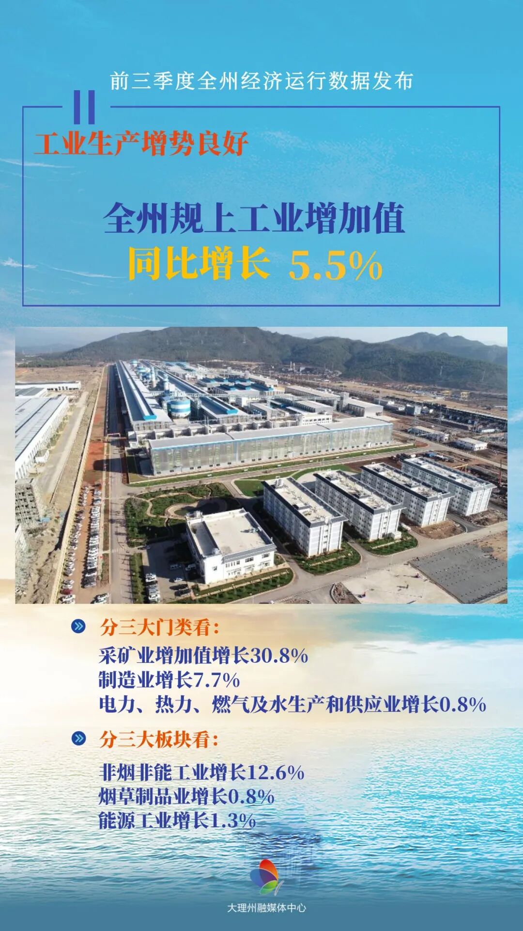 前三季度,全州规上工业增加值同比增长5.5%。分三大门类看,采矿业增加值增长30.8%,制造业增长7.7%,电力、热力、燃气及水生产和供应业增长0.8%。分三大板块看,非烟非能工业增长12.6%;烟草制品业增长0.8%,能源工业增长1.3%。