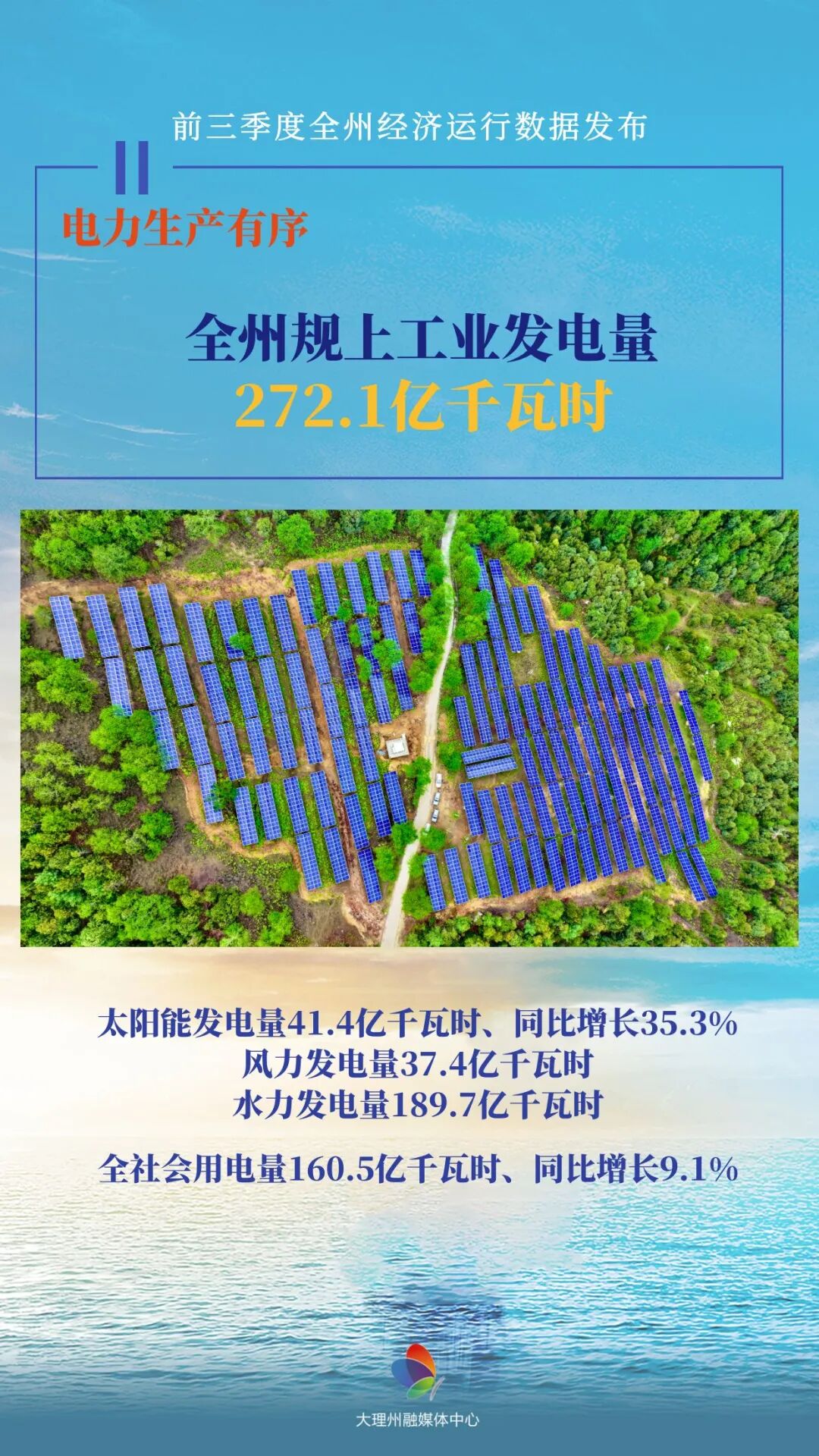前三季度,全州规上工业发电量272.1亿千瓦时。其中,太阳能发电量41.4亿千瓦时、同比增长35.3%;风力发电量37.4亿千瓦时,水力发电量189.7亿千瓦时。