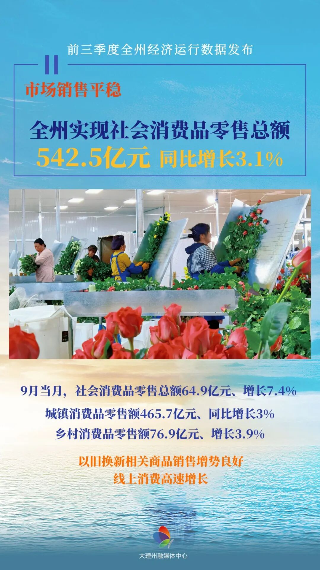 前三季度,全州实现社会消费品零售总额542.5亿元、同比增长3.1%。9月当月,社会消费品零售总额64.9亿元、增长7.4%。