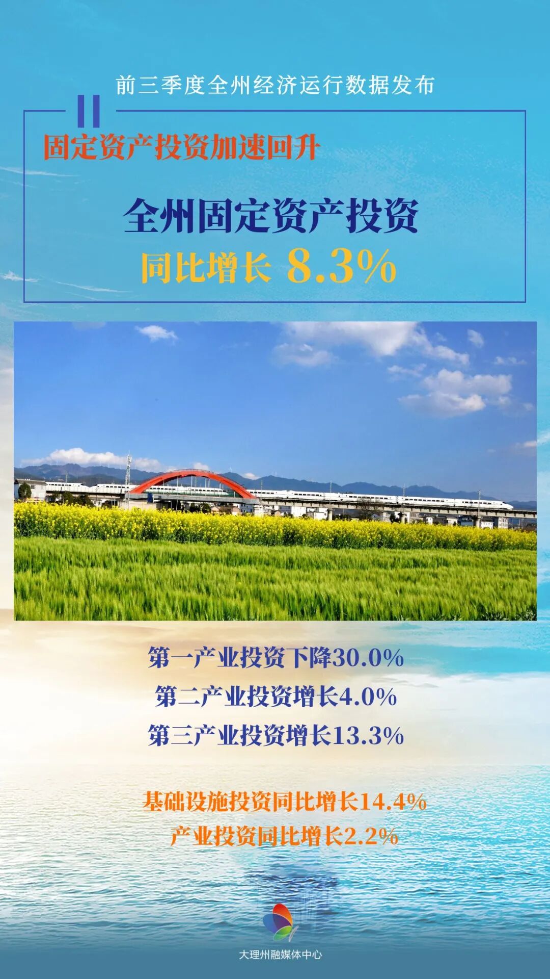 前三季度,全州固定资产投资同比增长8.3%。分产业看,第一产业投资下降30.0%,第二产业投资增长4.0%,第三产业投资增长13.3%。