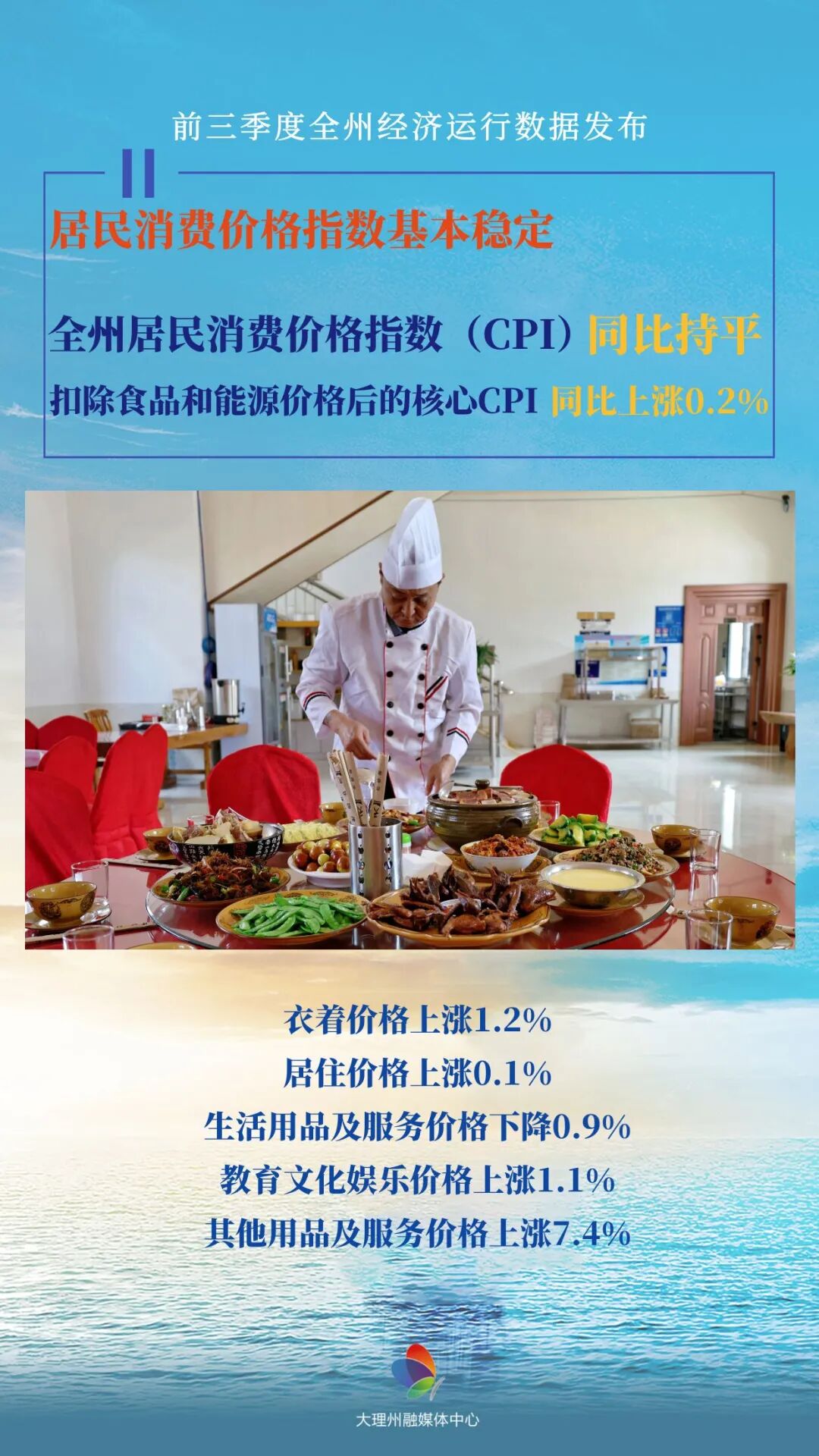前三季度,全州居民消费价格指数(CPI)同比持平。分类别看,食品烟酒价格下降0.1%,衣着价格上涨1.2%,居住价格上涨0.1%,生活用品及服务价格下降0.9%,交通通信价格下降2.6%,教育文化娱乐价格上涨1.1%,医疗保健价格持平,其他用品及服务价格上涨7.4%。在食品烟酒价格中,鲜菜价格上涨0.2%,粮食价格下降2.9%,鲜果价格上涨4.5%,猪肉价格上涨1.4%。