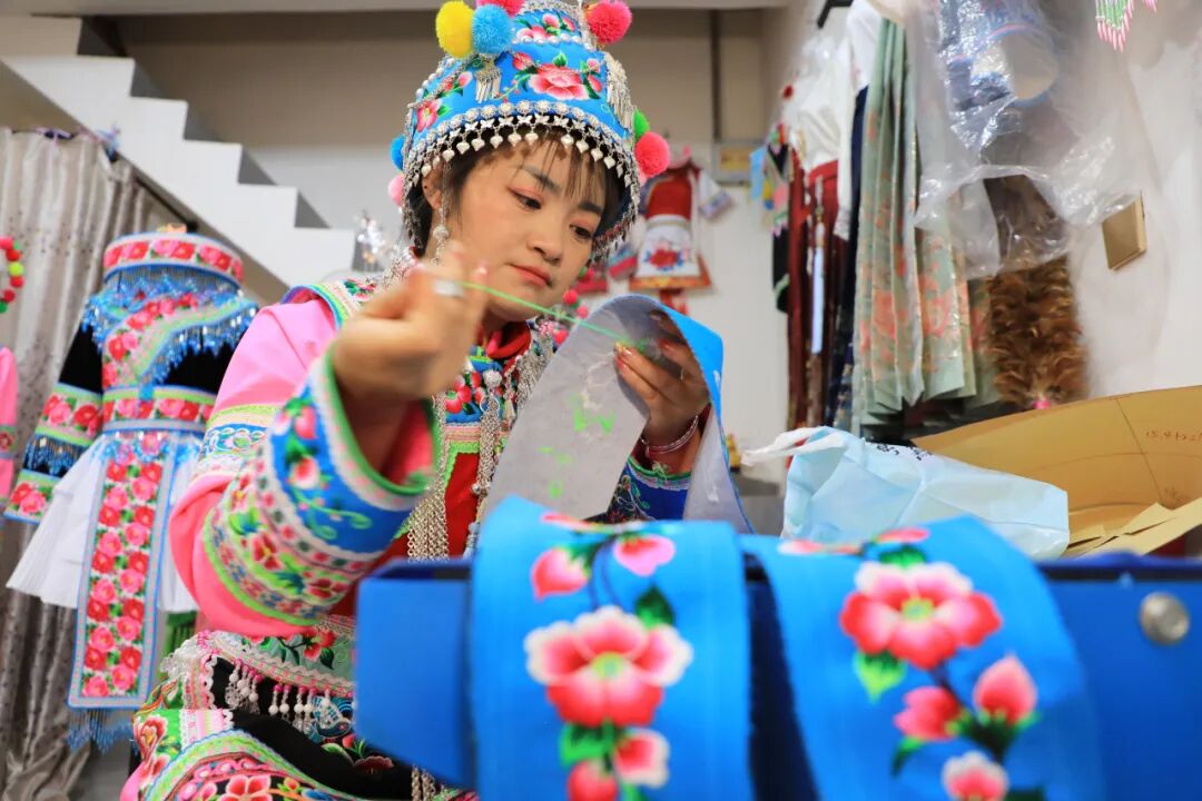 同样喜欢刺绣的漾濞县富恒乡“90后”绣娘李洁,也在用自己的方式传承着彝绣技艺。自幼生长在少数民族村落的李洁,对刺绣有着浓厚的兴趣。在长辈们的悉心教导下,她14岁便能独立完成鞋、包等刺绣作品。她不仅精通刺绣技艺,还热衷于民族服装的设计与制作。在她的“彝见钟情工作室”里,挂满了她自主设计的彝族、苗族等民族服装。