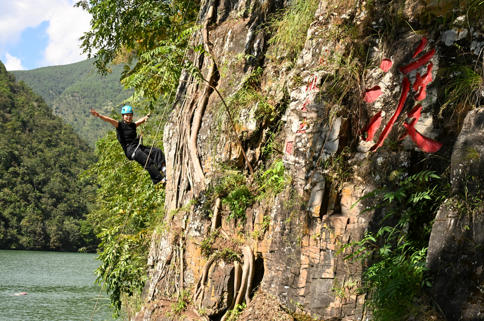 游客在澜沧江猛龙渡体验“攀岩”运动。欧阳贵鸿 摄