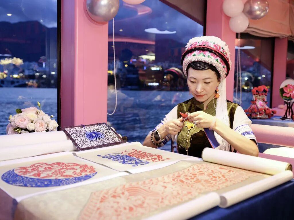白族扎染的蓝,不是随便的蓝,是匠人对着洱海月调出来的“月白蓝”;银器锻制时,匠人最爱选有洱海月的夜晚,千锤百炼后,银镯子上会錾出一圈“洱海月纹”;就连甲马木刻里的“月神”,手里也捧着一轮小小的洱海月;剪纸里的洱海月,要对着真实的月牙儿描轮廓,剪出来的月才会“有洱海的柔,有苍山的刚”。