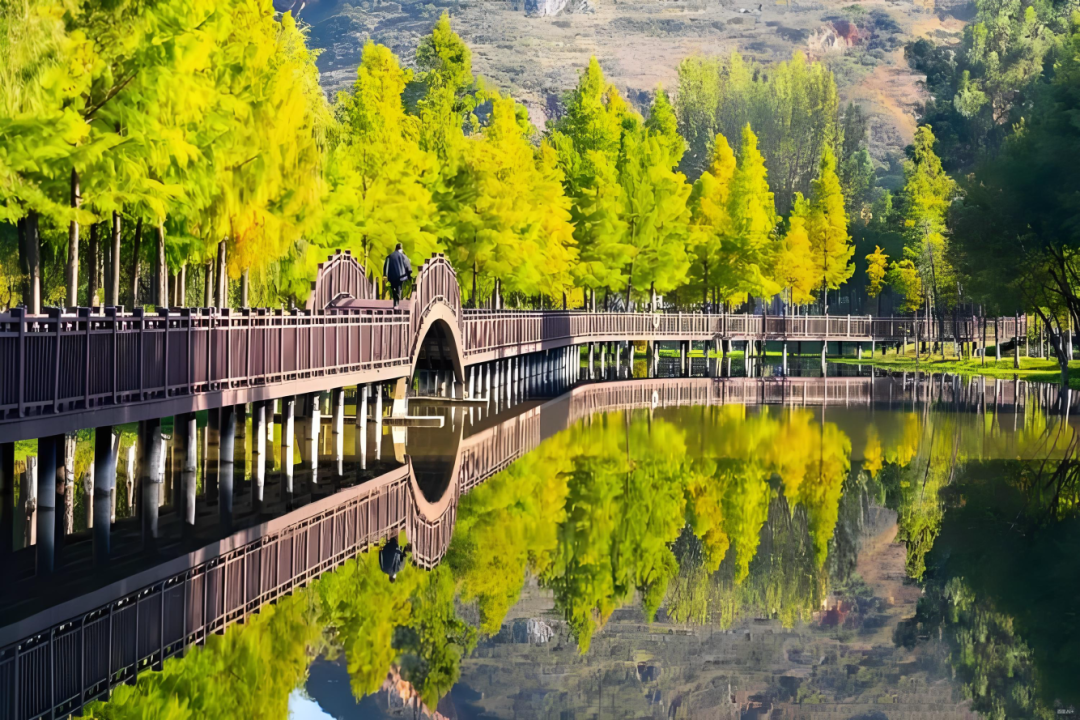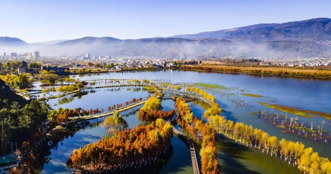 茈碧湖如明珠镶嵌,初冬水杉通红,倒映成画;徐霞客笔下的“世外桃源”凤羽古镇、文艺打卡地“大地艺术谷”……人文与自然在此完美交融。