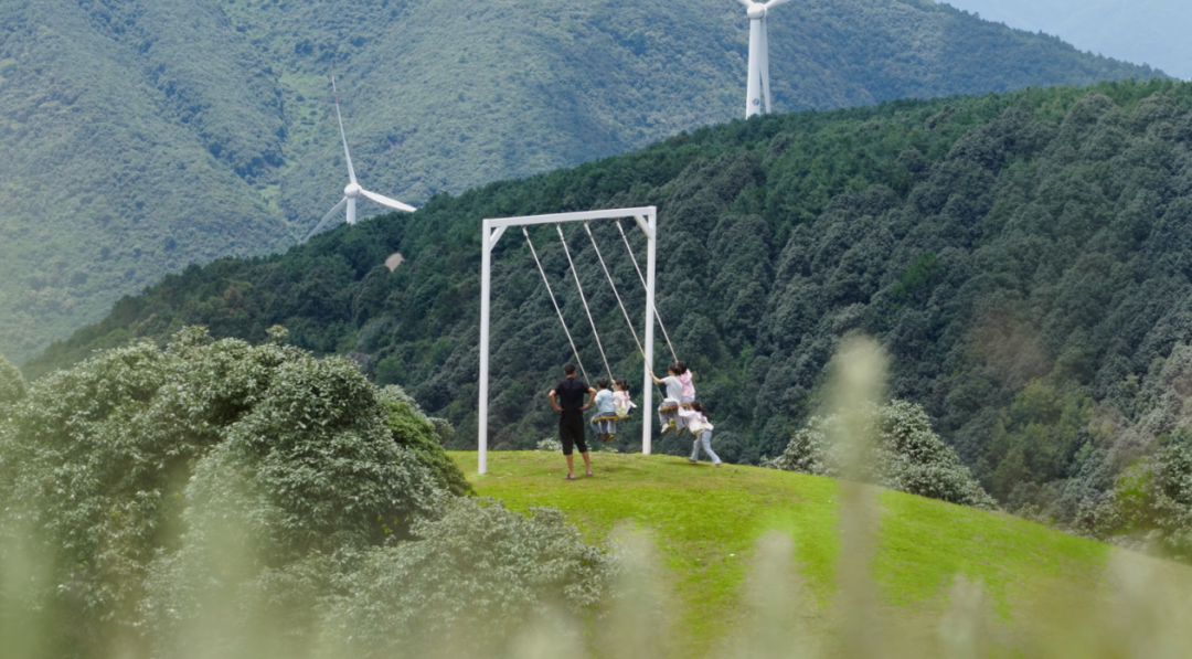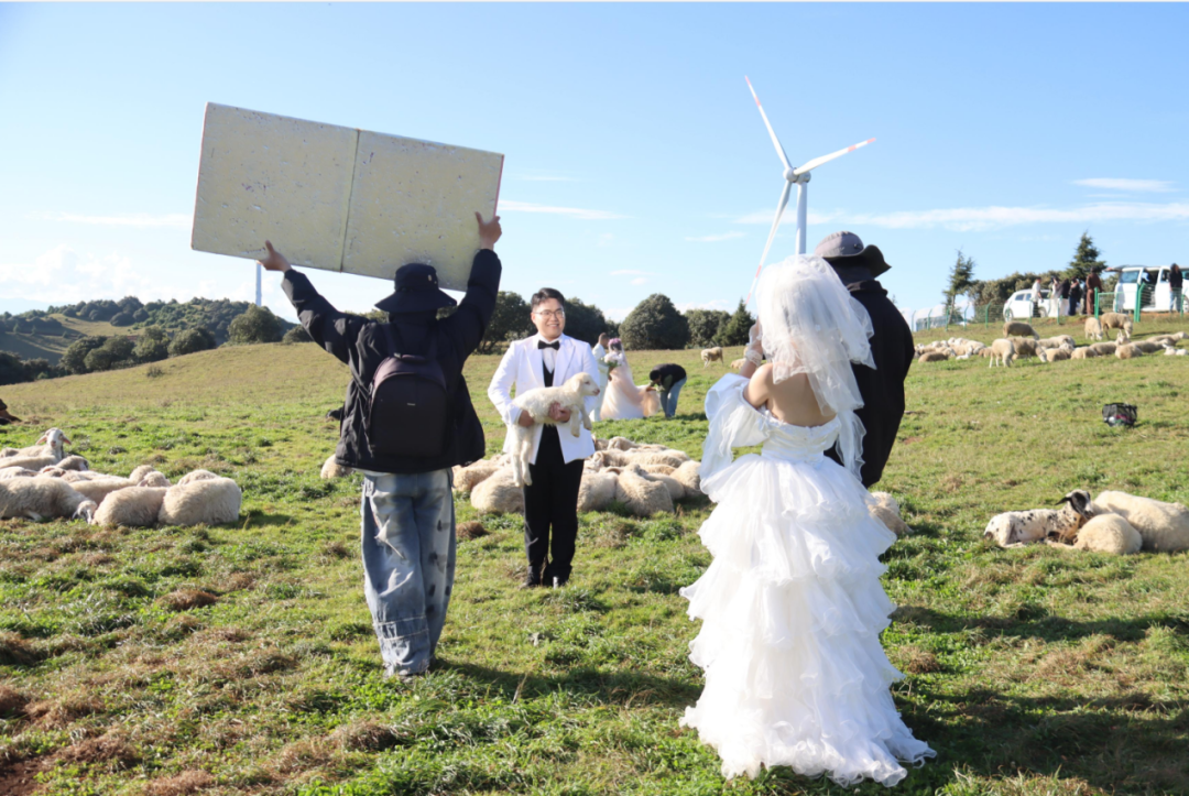 草甸上,旅居生活的各种可能正在上演——来自北京的摄影师在捕捉新人的婚纱照,白色头纱在秋风中轻扬;几个长期旅居的家庭在帐篷区组建了临时的“社区”,孩子们在秋千上欢笑嬉戏;来自福建的旅人则在草甸上,小心翼翼地抱起一只小羊合影。