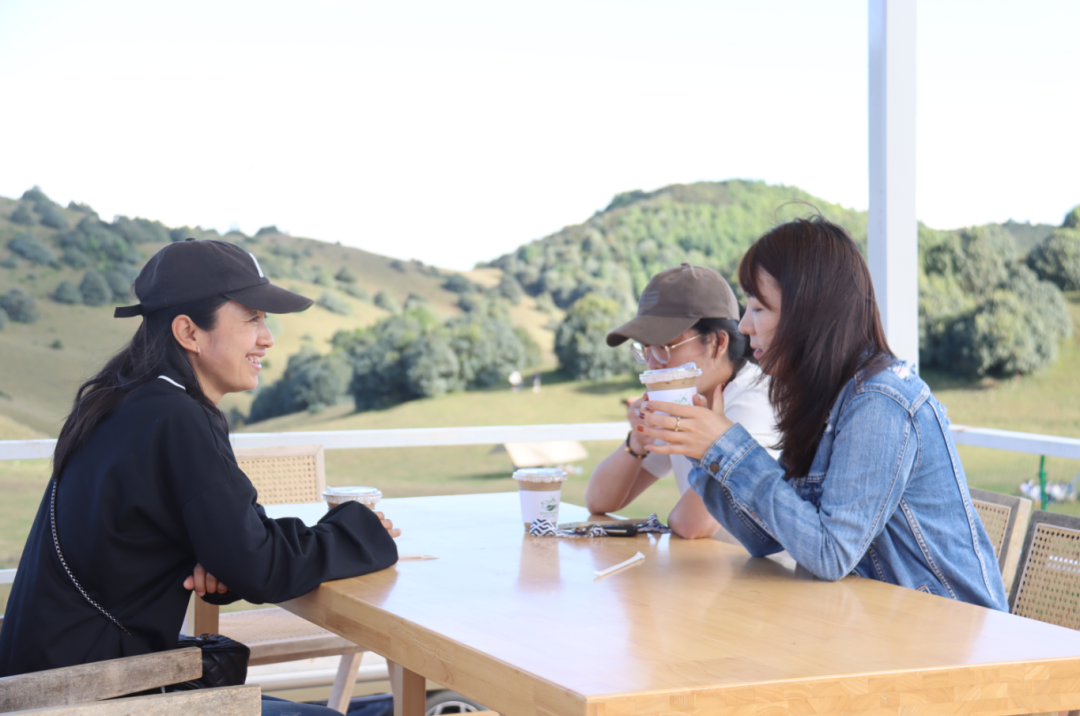 午后是最惬意的时光。旅居者们散落在咖啡厅的各个角落:露台上,有人在静静欣赏秋日美景;草甸间,人们迎着秋风舒展身体;木质长廊里,几个年轻人正在策划下一站的旅居计划。这里既是驿站,也是家园,让每个过客都找到归属。