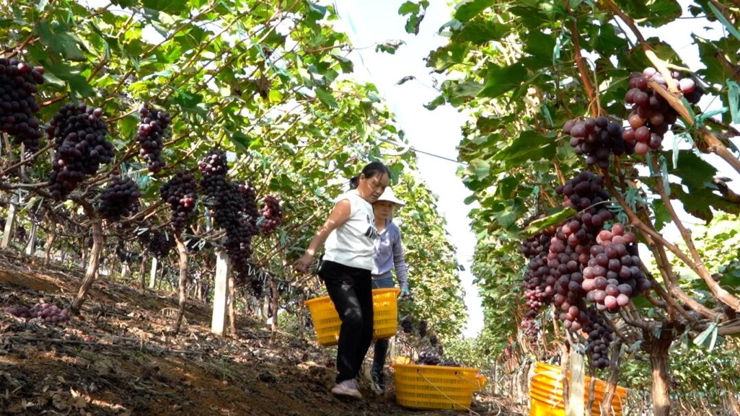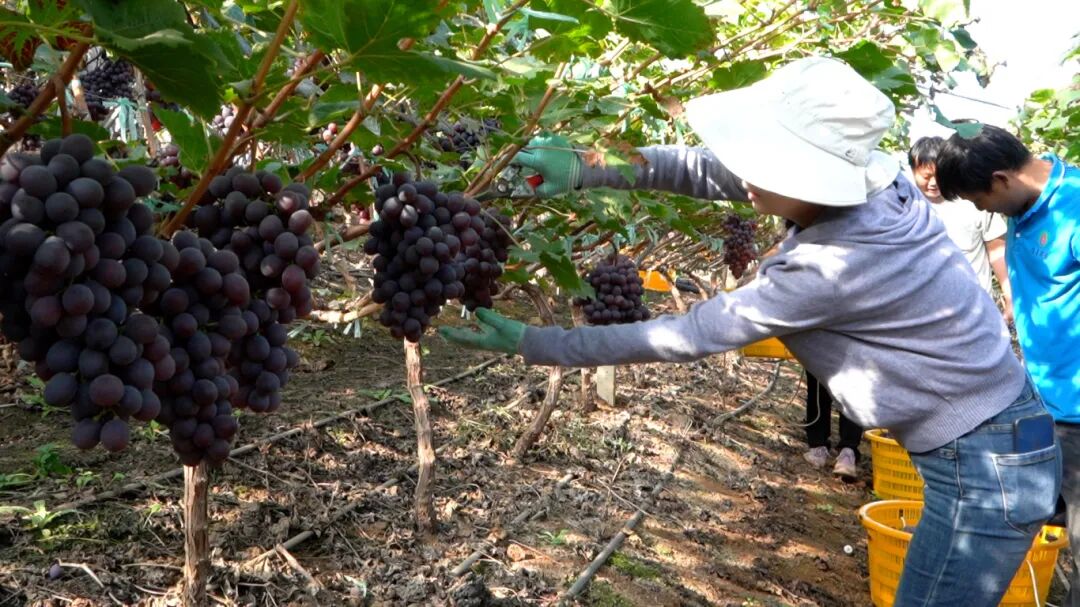 在金牛镇金甸村委会的葡萄园里,种植户钟棓钞正忙着组织工人采收错季红提葡萄。