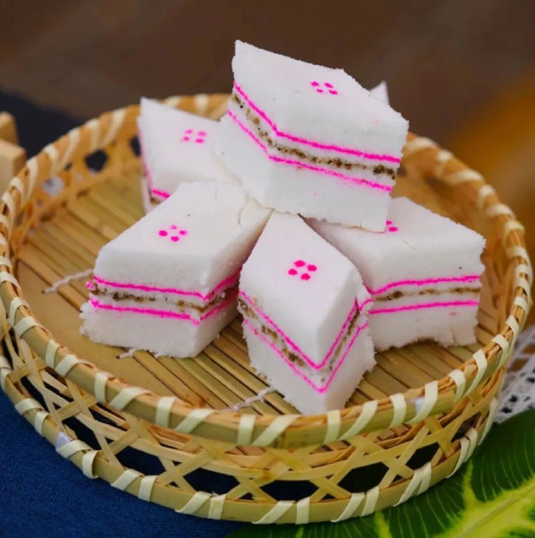 鹤庆米糕香糯可口,甜而不腻,是鹤庆的传统食品。常见的有切成菱形的干糕,雪白的糕块上,或点缀着粉色的花型红点,或铺满香甜的红糖和芝麻,有的中间还有夹心,口感丰富,是当地人喜爱的美食之一。