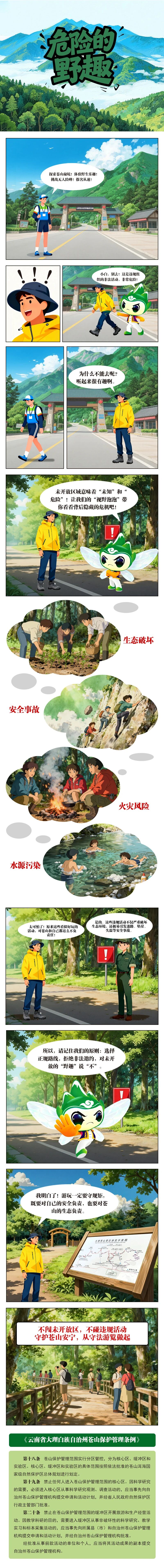 最新发布的《苍山保护管理条例》漫画解读,通过生动故事提醒游客:遵守游览规定,不仅是对苍山生态的保护,更是对自身安全的负责,让我们共同维护苍山的美丽与安宁。