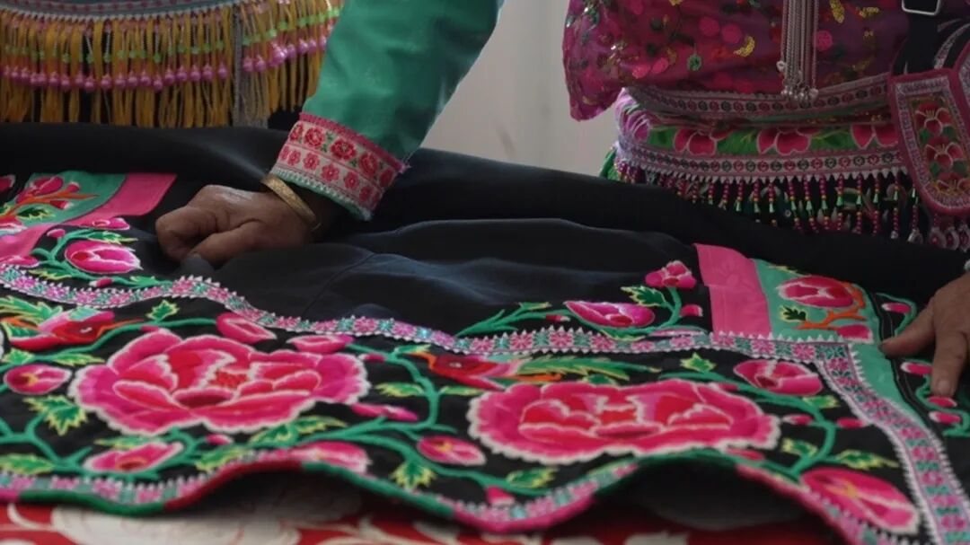 关坪乡关坪村村民字龙飞15岁起便跟着妈妈学习刺绣,她展开围腰自豪地介绍妈妈的绣品。