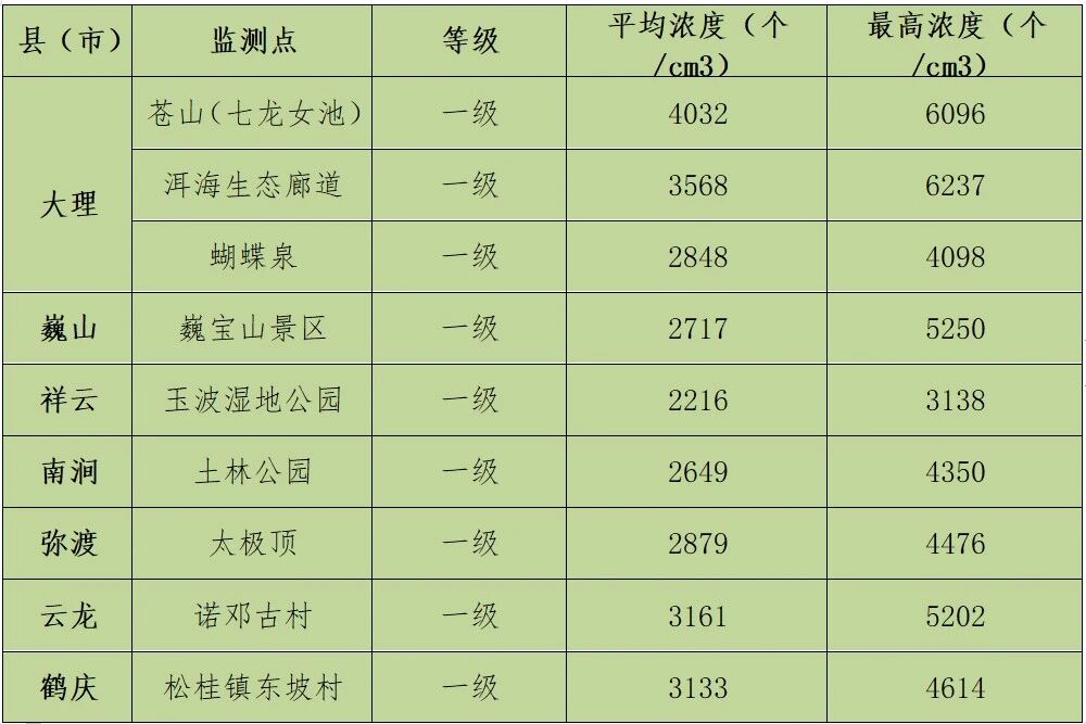 大理州空气负(氧)离子浓度