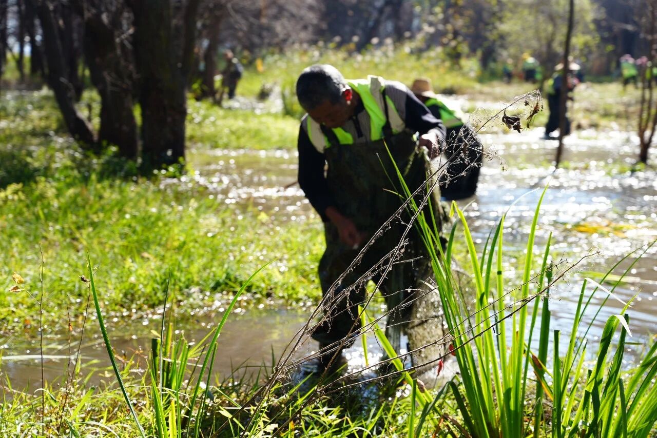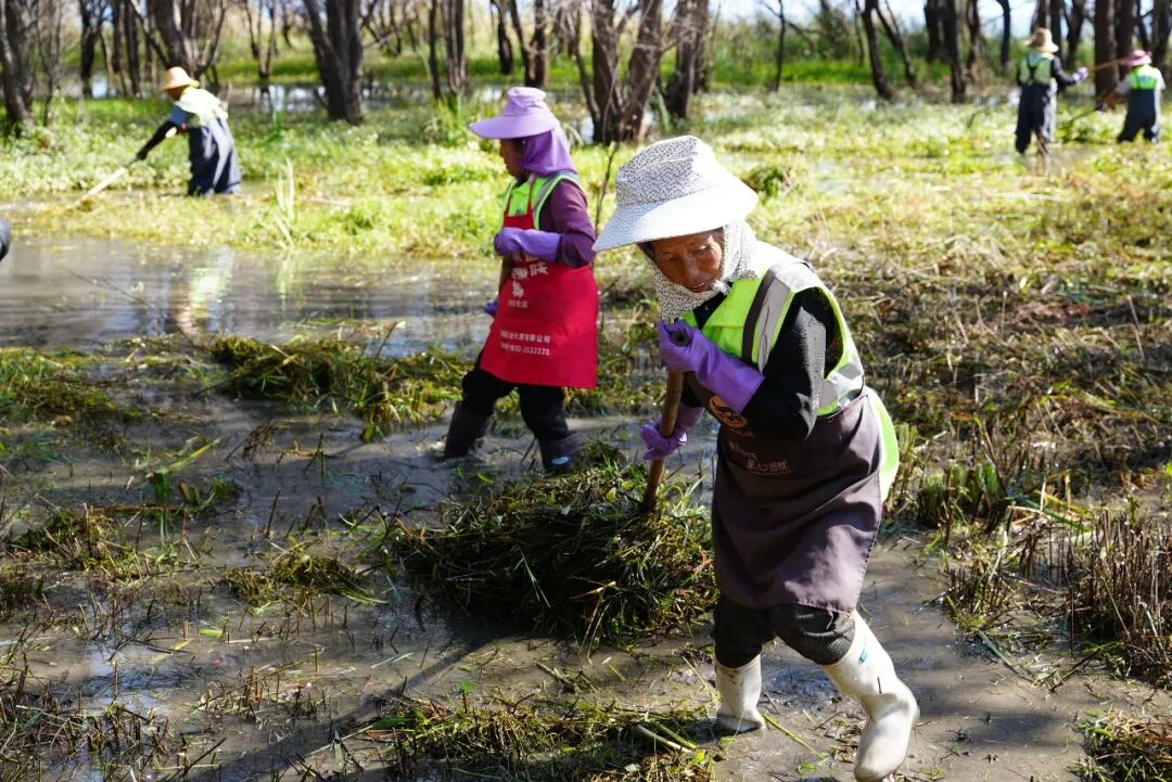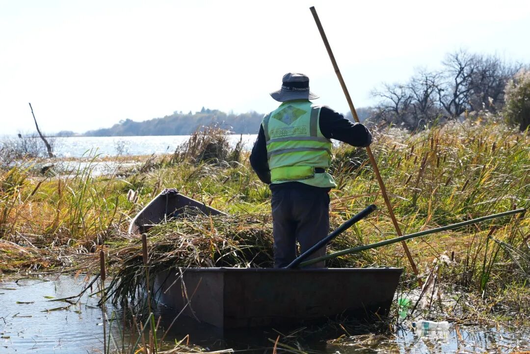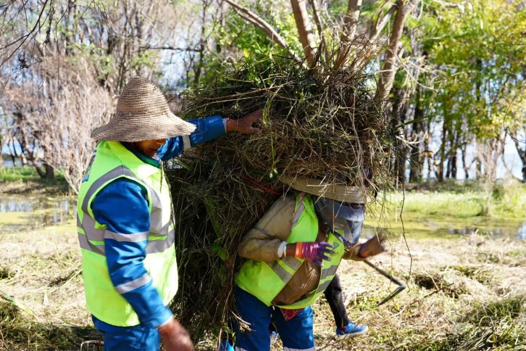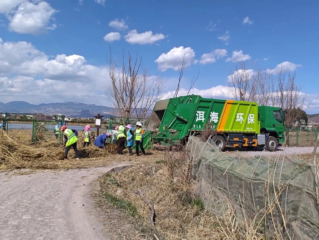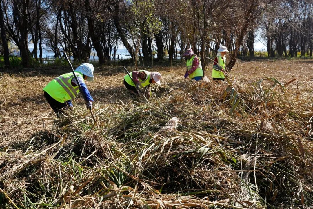 清晨,薄雾如轻纱般拂过洱海。在大理市上关镇北三江湿地,一群身着醒目工作服的滩地保洁员,手持工具,在晨光中弯腰起身,将枯黄的菹草、芦苇等水生植物整齐码放。水波轻漾,船只在湖中缓缓推进,宛若一场为洱海精心安排的冬日“梳妆”。