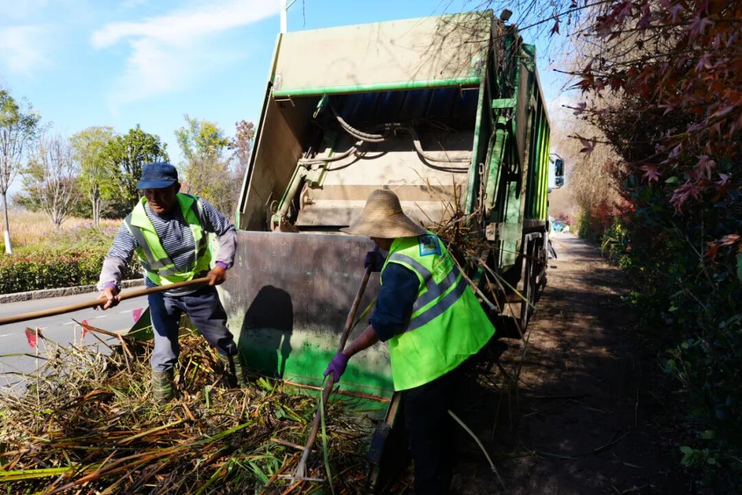 两人一组,一前一后。前一人挥动长柄镰刀,熟练地将枯黄的菹草、芦苇成片割下;后者紧跟其后,弓身抱起湿重的水草,一趟趟运往船中。船满靠岸后,又有保洁员接力搬运,晾晒后再一捆捆背到路边,最终装进封闭压缩式垃圾清运车。从水里到船上,从岸边到车边,每一个环节都依靠保洁员的双手与双肩完成,远比看上去的更为沉重艰辛。