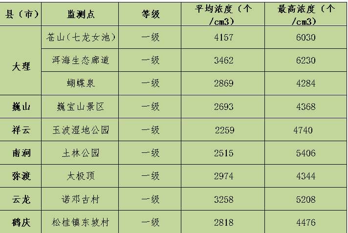 大理州空气负(氧)离子浓度