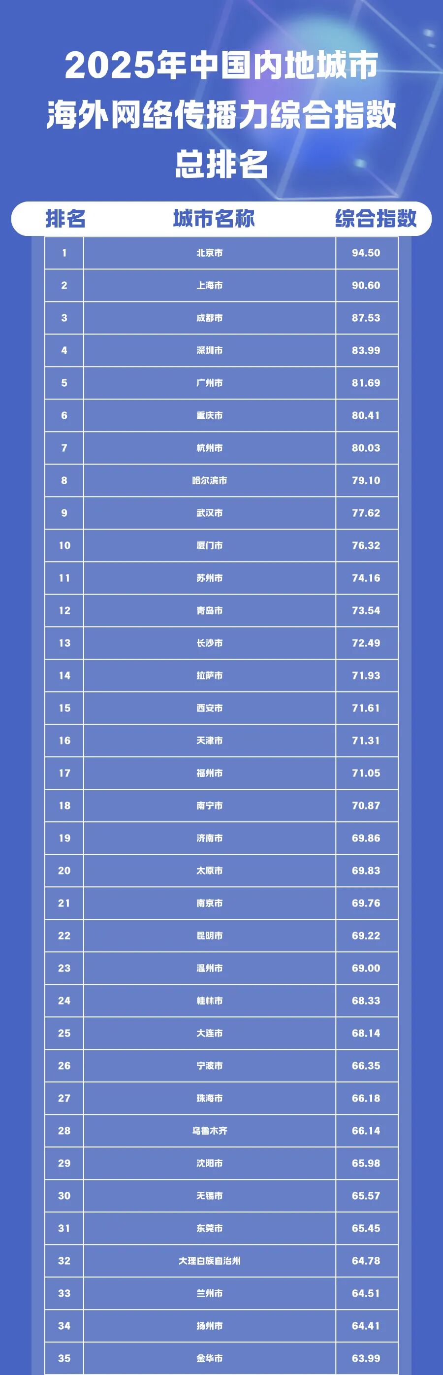 报告显示2025年中国338座城市(自治州、地区、盟)海外网络传播力综合指数总排名。其中,大理州位居全国第32位,在云南省排名第二。
