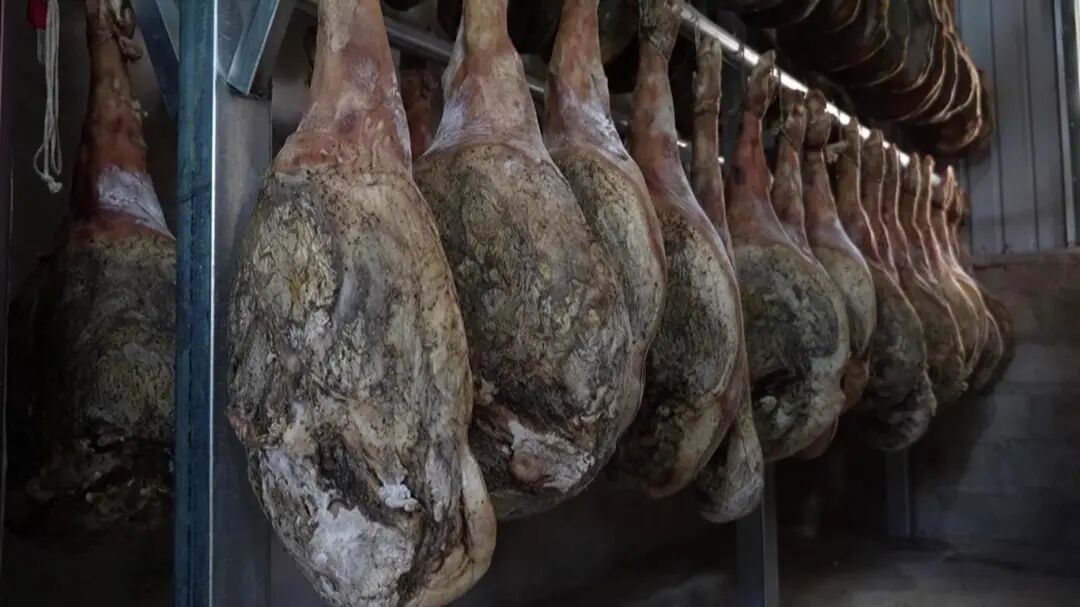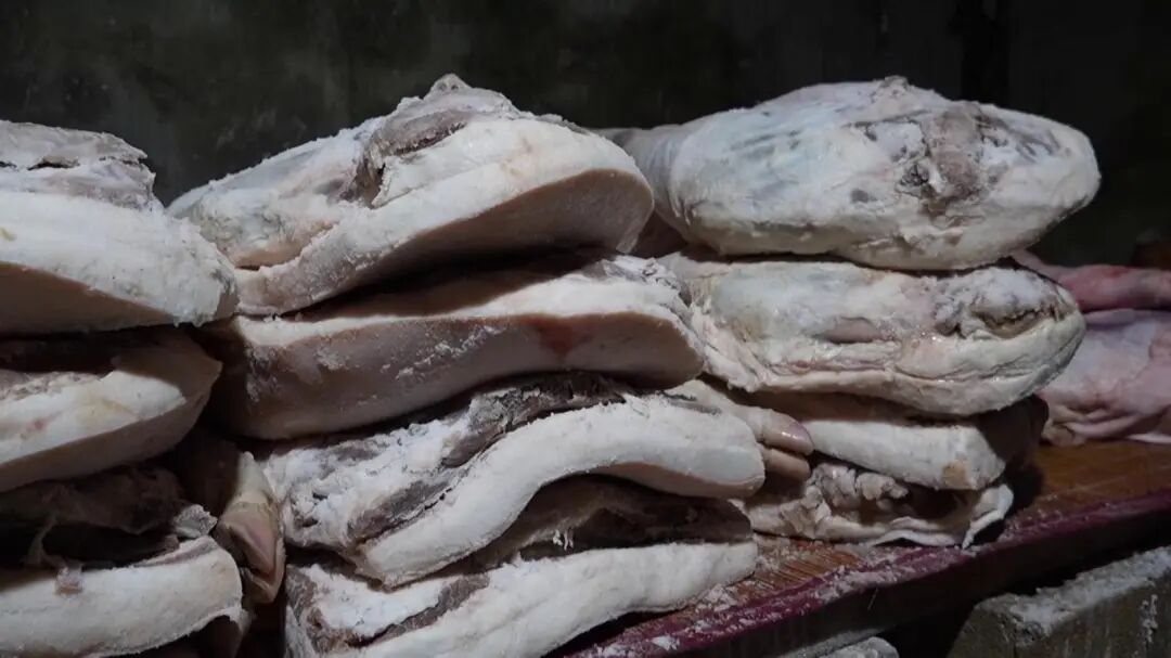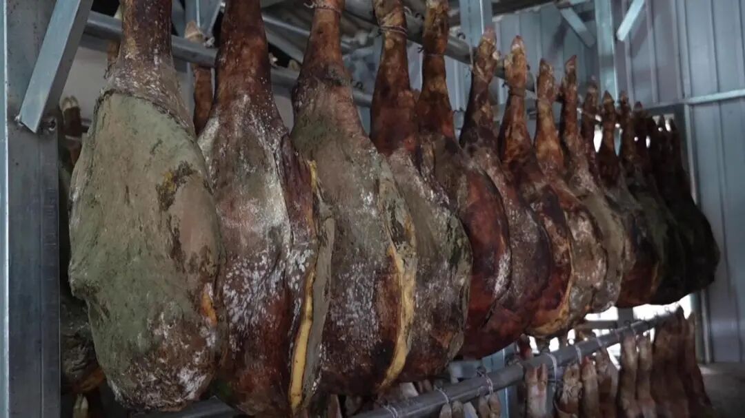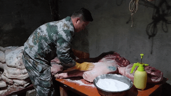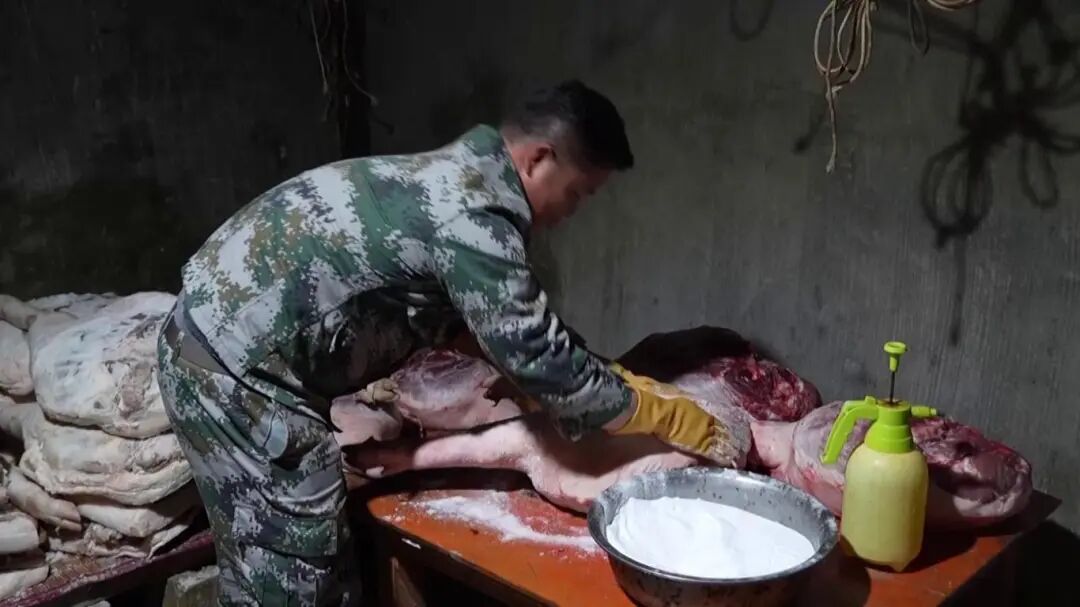 火腿腌制的最佳时段便是冬至后到立春前,寒冷的天气能有效助力火腿的腌制与发酵,避免变质。刚分割好的猪后腿,要先放在阴凉干燥处静置,仔细修面造型成琵琶状,把里面的血水彻底挤干。等肉从里到外完全凉透,腌制的核心步骤就正式开始了。