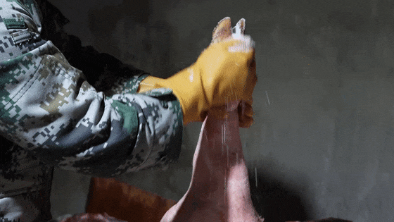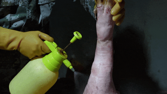 第一步便是喷酒上盐。先在猪腿上均匀喷一层高度白酒,既能去腥,又能为后续发酵打下基础。接着,要顺着脚趾的方向,从皮到肉细细搓盐。“一直搓,搓到整只火腿的表皮发红、发软,再把火腿翻过来,肉面朝上。”代建华演示着动作,补充道,“这时再喷上苞谷酒,进行第二次上盐。但肉面不能太用力搓,不然会破坏肉质纤维。”