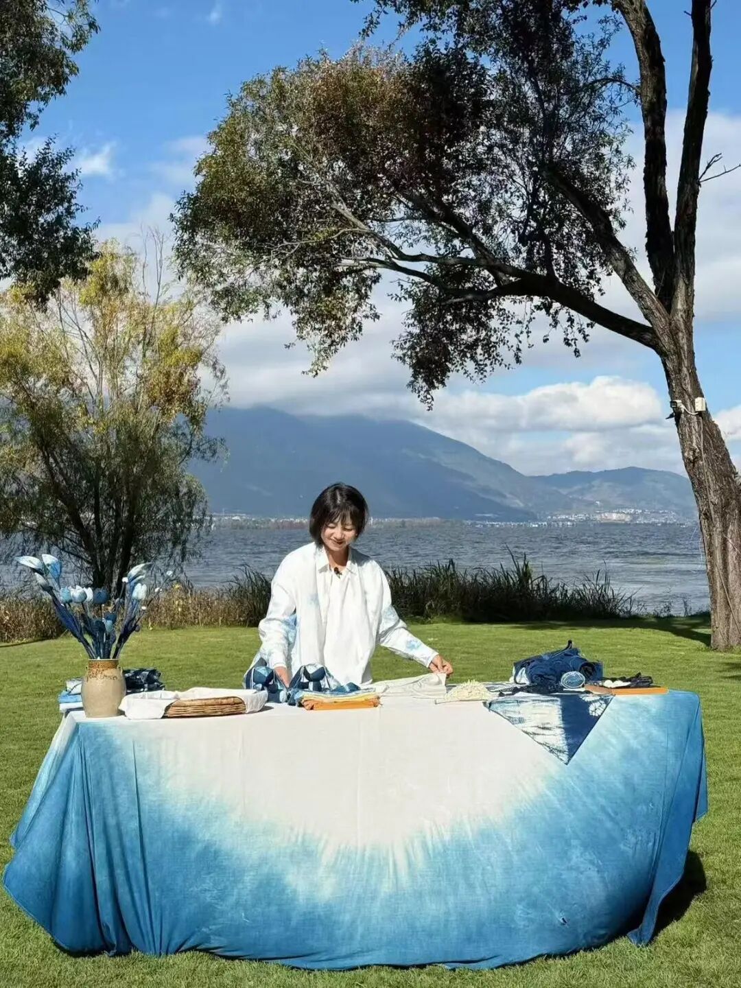 不同于传统扎染体验的观摩式教学,“蓝续”开创性地打造了“五感沉浸式体验”:触摸棉麻织物的温润肌理,细嗅板蓝根与密蒙花的自然芬芳,聆听白族纹样背后的文化故事,品尝染材制成的茶饮与米饭,观赏苍洱间的田园盛景。在这里,旅居者不再是旁观者,而是文化共创者。