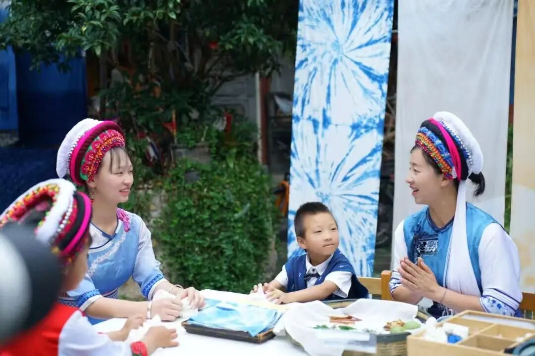 白族姑娘、儿童围坐在桌前,一起体验扎染制作。