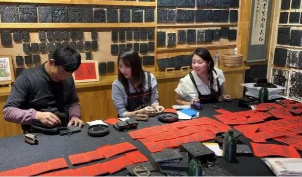 推开传习馆的大门,墨水清香与手工纸的质朴气息交织,墙上、架上整齐摆放着1000多种雕版,既有“水草大王”等传统祈福纹样,也有网红打卡点、地方文物等创新题材,甚至还有“哪吒”“摆烂悟空”这类贴合年轻审美的图样。