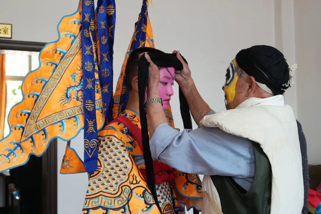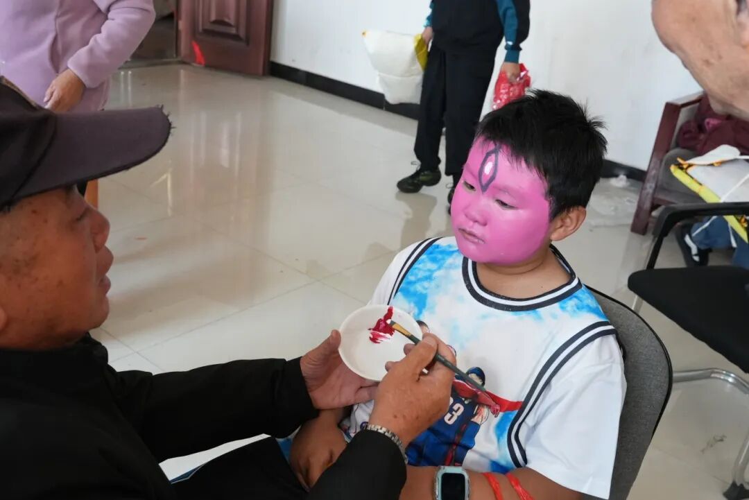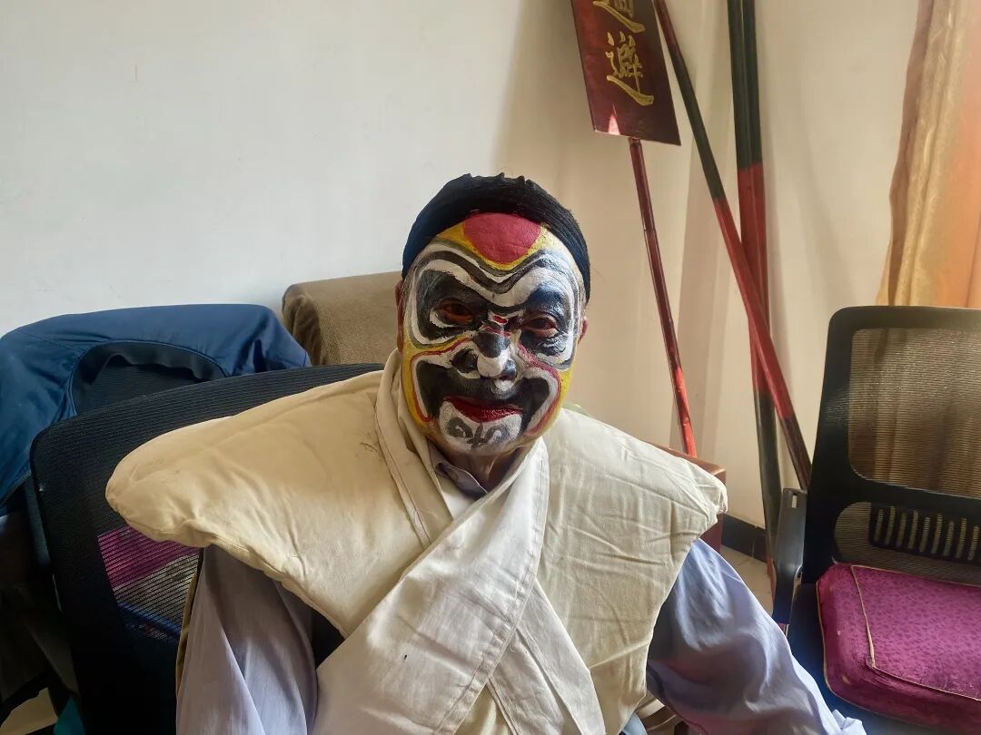 清晨,后台已是片忙碌。演员们描画脸谱,准备着即将登场的行头。妆容威武的“武财神”格外引人注目——80岁的郑根源正熟练地勾画着脸谱,从妆容到服饰,都由他自己一手置办。
