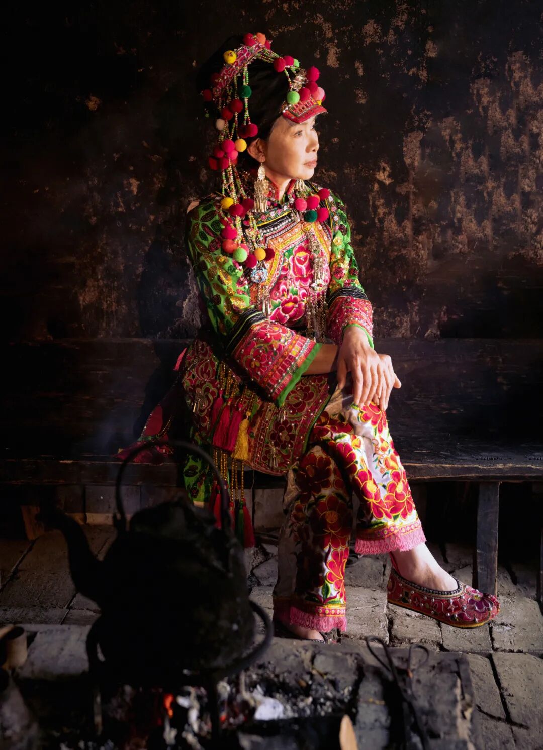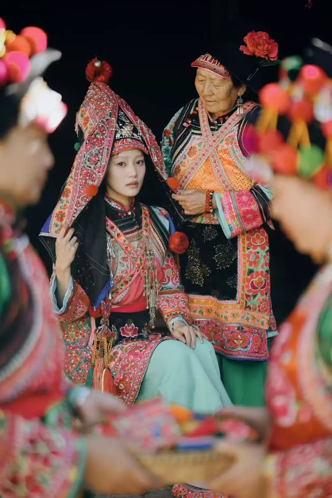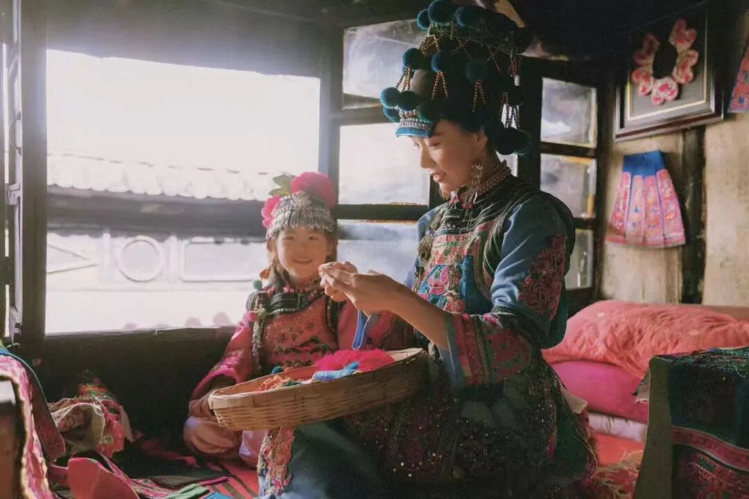阿妈粗粝的手轻抚过少女的绣冠,眉眼间的温柔比身上的繁花更动人,这是彝家代代相传的牵挂。