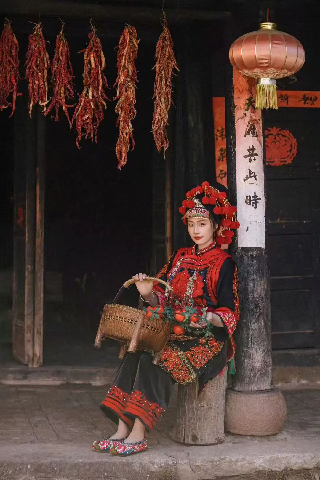 檐下红串摇,篮中柿果暖,彝家少女静坐在百年老屋前娇俏动人,把乡土的丰饶与烟火酿成了诗。