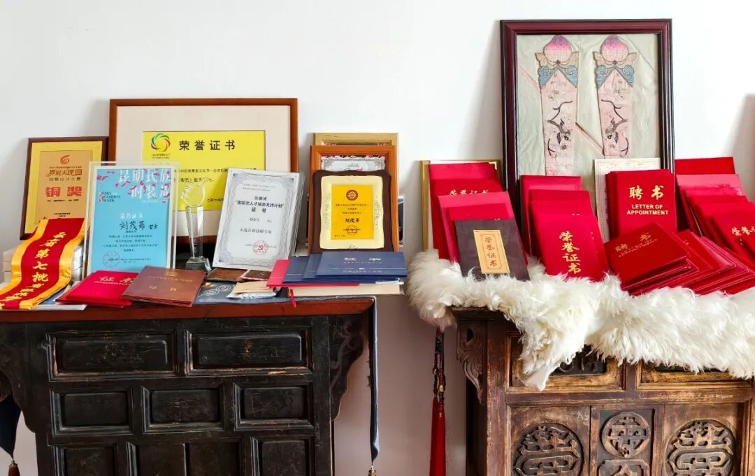 自1998年创立个人工作室以来,刘茂菲的步伐始终坚定而稳健。她不断砥砺技艺,绣工针法细腻入微,构图生动传神,尤其专注于挖掘和复原那些濒临失传的白族传统纹样与工艺。