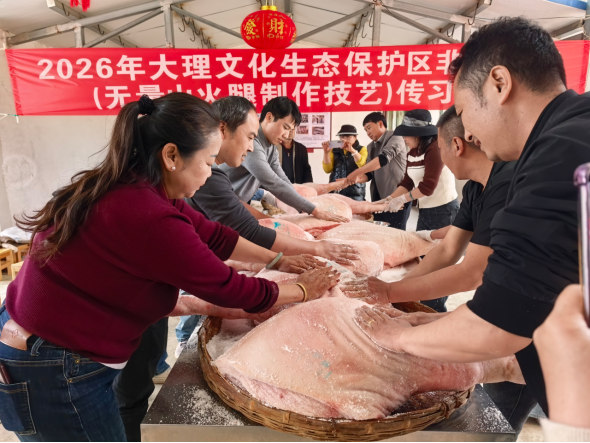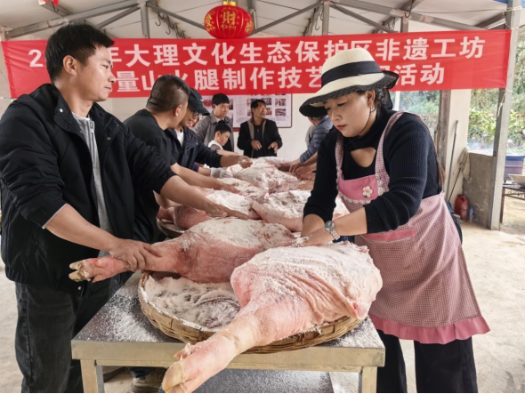 为深入巩固大理文化生态保护区建设成果,加强非物质文化遗产系统性保护,促进传承人群技能提升与就业拓展,在大理文化生态保护区保护发展中心(大理州非物质文化遗产保护中心)指导支持下,2月28日至3月1日,大理州州级非遗工坊南涧县德恭食品有限责任公司开展了为期两天的无量山火腿制作技艺传承培训活动。35名周边村民、火腿制作技艺爱好者参加培训。