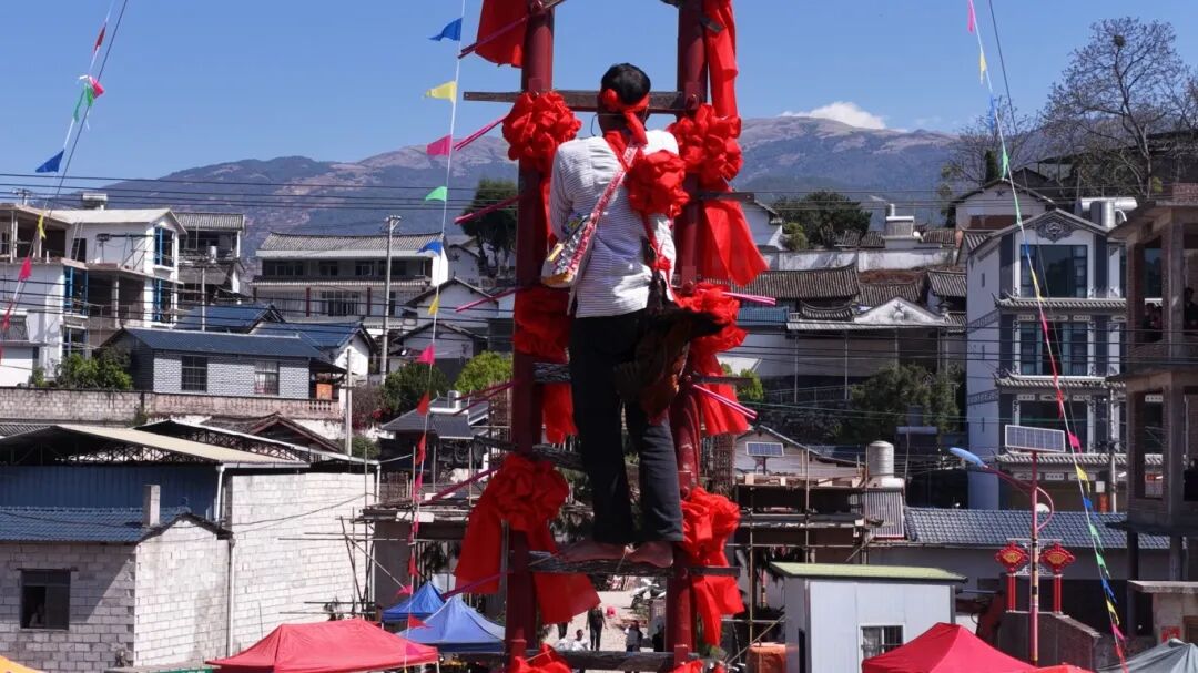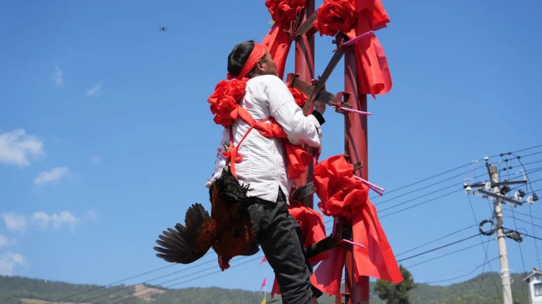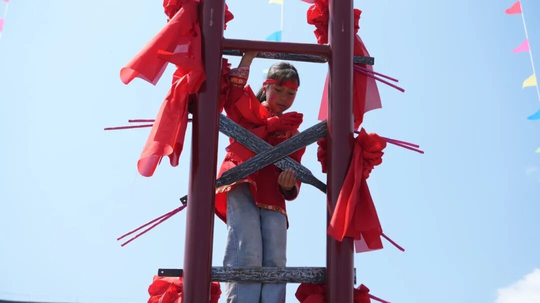 此次活动的重头戏傈僳族“上刀山、下火海”非遗展演,吸引了在场所有人的目光。仪式完整呈现点花、点刀、祭刀杆、上刀山等传统环节,12余米高、36把钢刀架成的刀杆矗立广场,表演者赤足踏上刀梯,身姿矫健、从容登顶。登顶后,表演者随即从布包内掏出包子、饵块、硬币、水果糖等往下抛撒,嘴里还念着祝福语,引得现场观众争相围抢。
