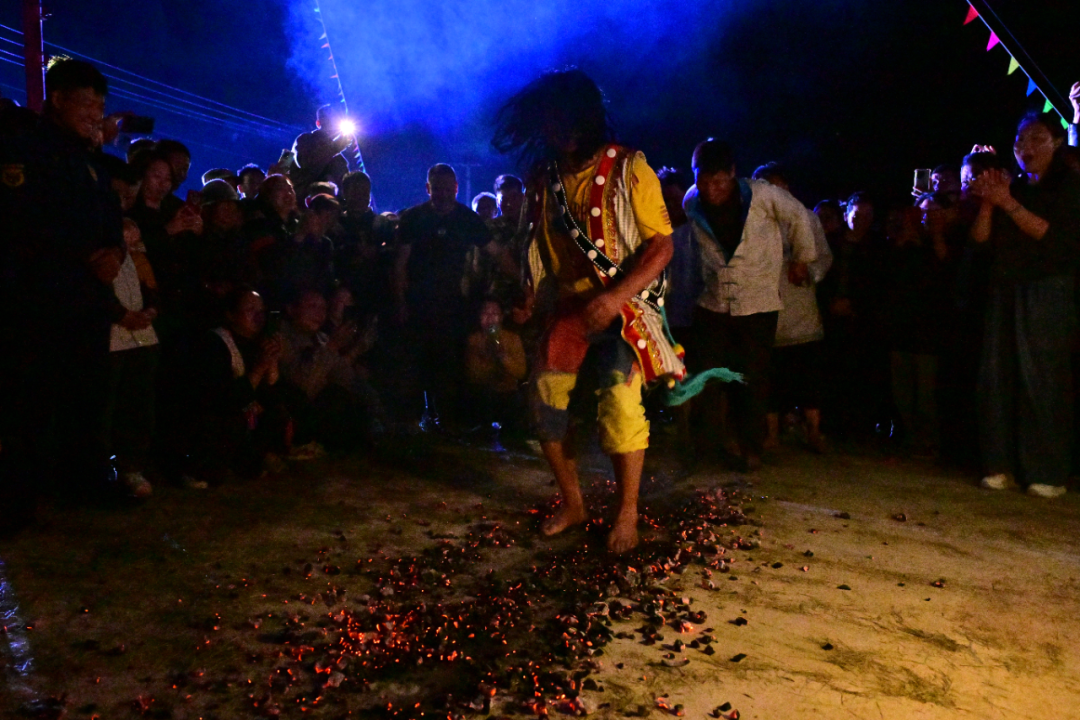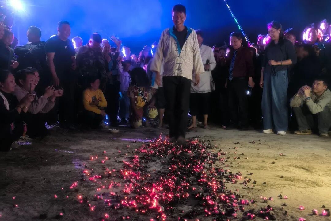 待夜幕降临,“下火海”展演又掀起活动的另一波高潮,表演者踏过熊熊炭火,尽显无畏勇气。