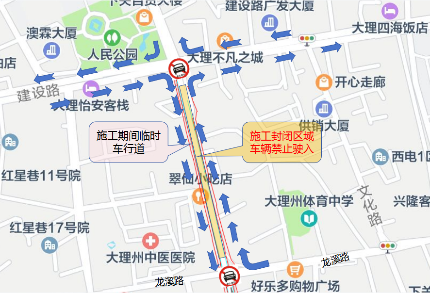 绕行线路3:建设路-新建小区桥-沙河埂规划道路-龙溪路(近大理一号桥农贸市场)。