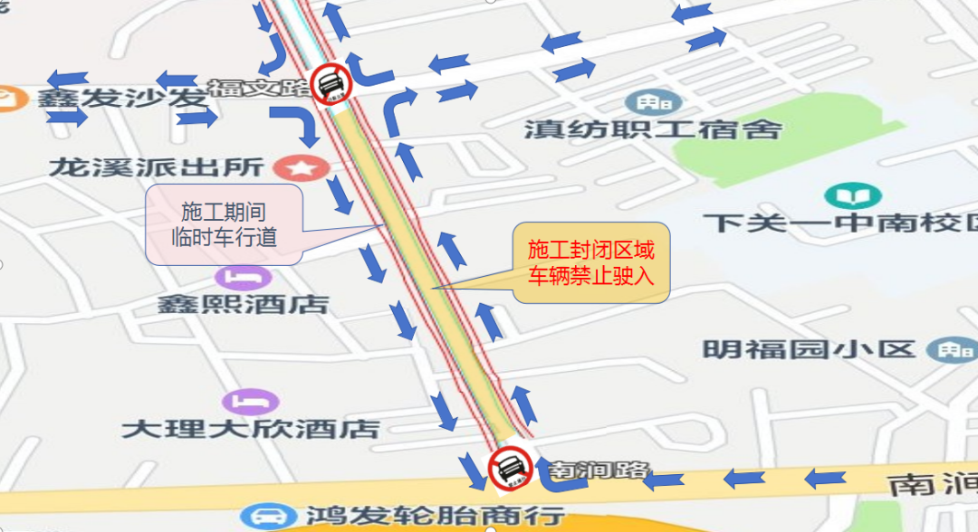 改造人民南路(南涧路-建设路段)左右两侧人行道作为临时车行道,改造完成后封闭人民南路(南涧路-福文路段、龙溪路-建设路段)车行道,进行雨污水管道及路面施工。