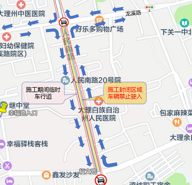 封闭人民南路(福文路-龙溪路段)车行道,进行雨污水管道及路面施工。(如图)