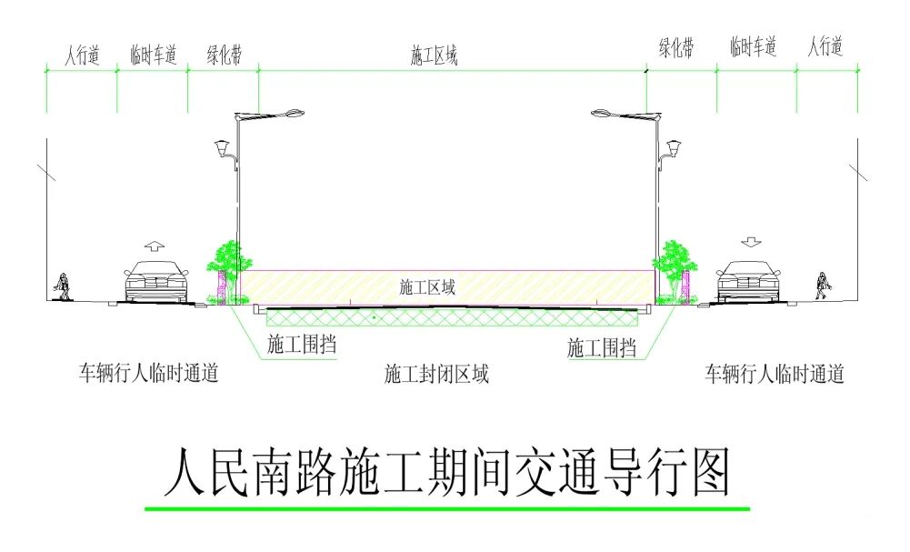 为有效减少城市交通通行影响,人民南路(南涧路-建设路)计划采取两个施工阶段分三段进行施工,具体为: