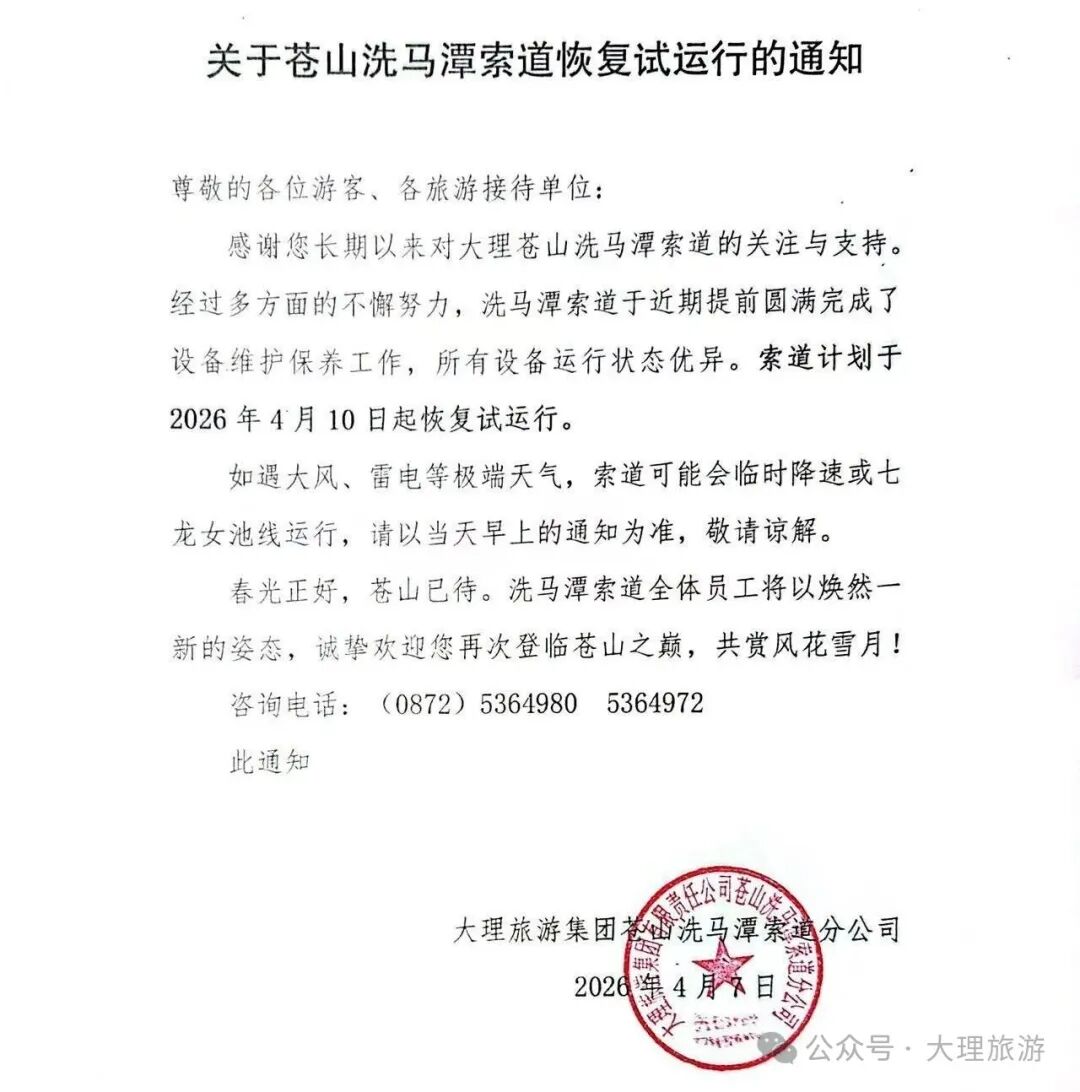感谢您长期以来的理解与支持!经过全面设备维护保养,大理苍山洗马潭索道将于 2026年4月10日起恢复试运行?
