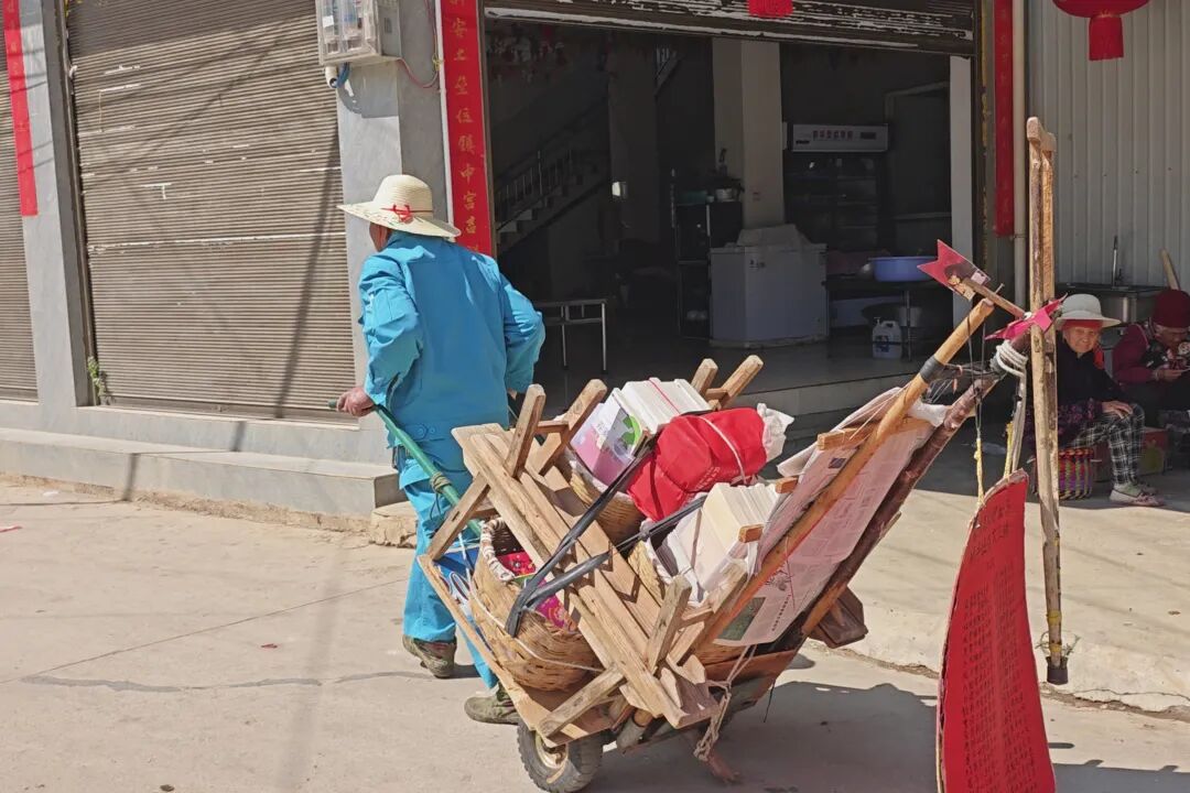 “来啦!”早上8点,和相熟的村民打过招呼后,74岁的李存德拄着拐杖,拉着自制小推车,来到大理白族自治州弥渡县弥城镇红星村委会的菜市场入口。他熟练地停稳小车、摆好书刊、支起报架、放好板凳。短短几分钟,一个简易却规整的乡村书摊就“开张”了。