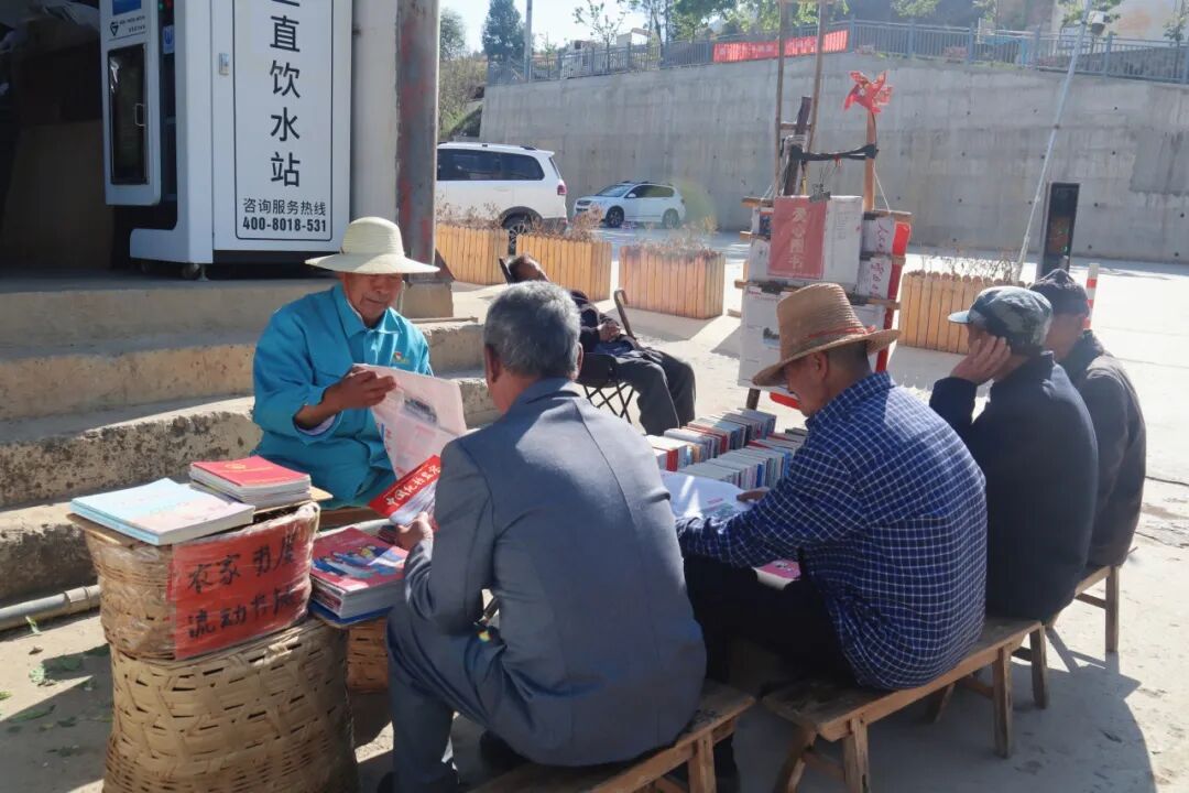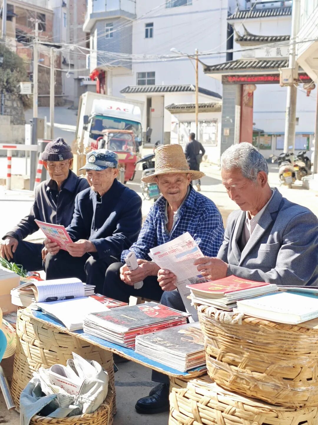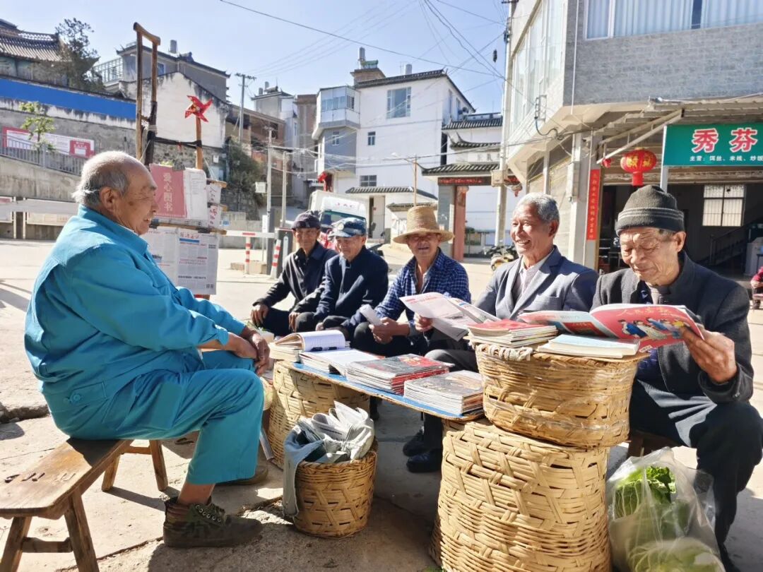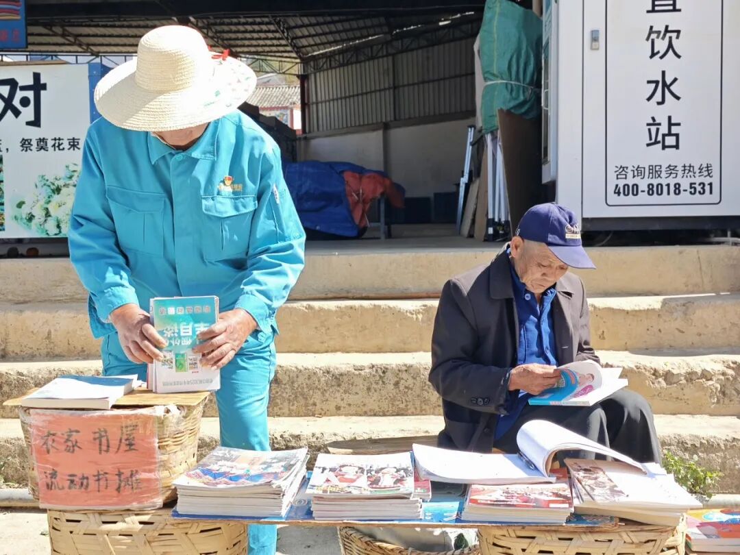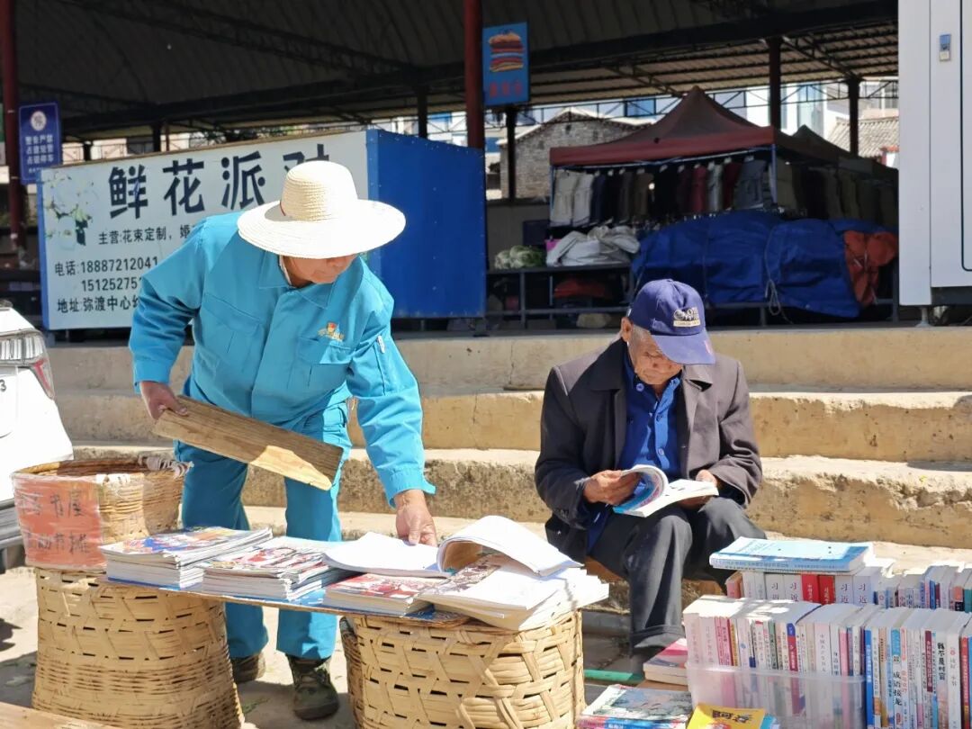 随着阳光洒落,李存德的书摊前渐渐围满了村民。小小的书摊上,各类政策、文化、生活类杂志和报纸都整齐摆放,推车背面还贴着李存德自己创作的弥渡花灯歌词。喧闹集市中,这个小书摊成了村民静心阅读的角落,有人读政策、有人看画册,氛围格外温馨。