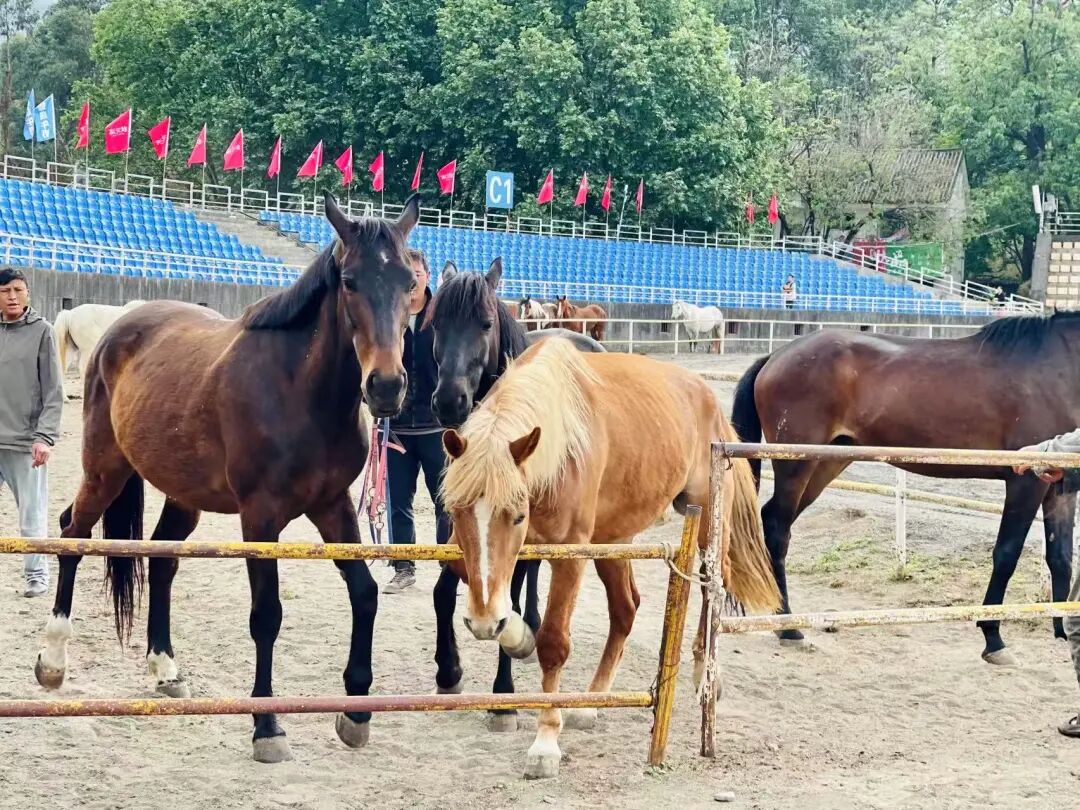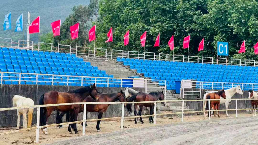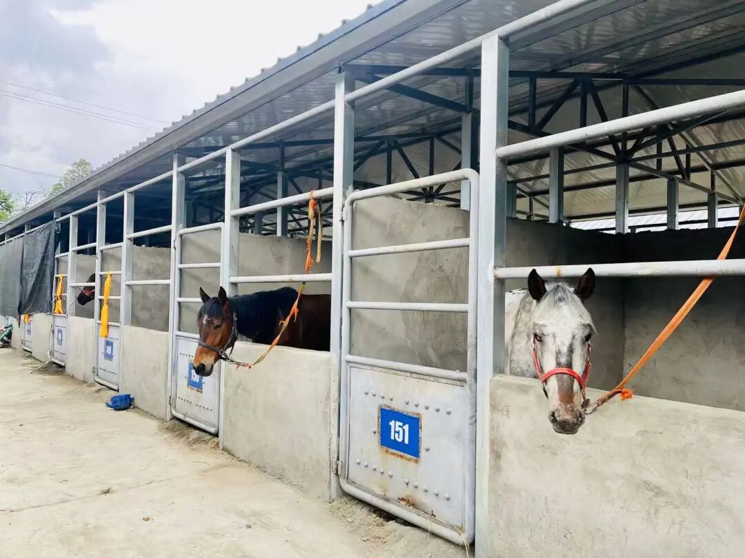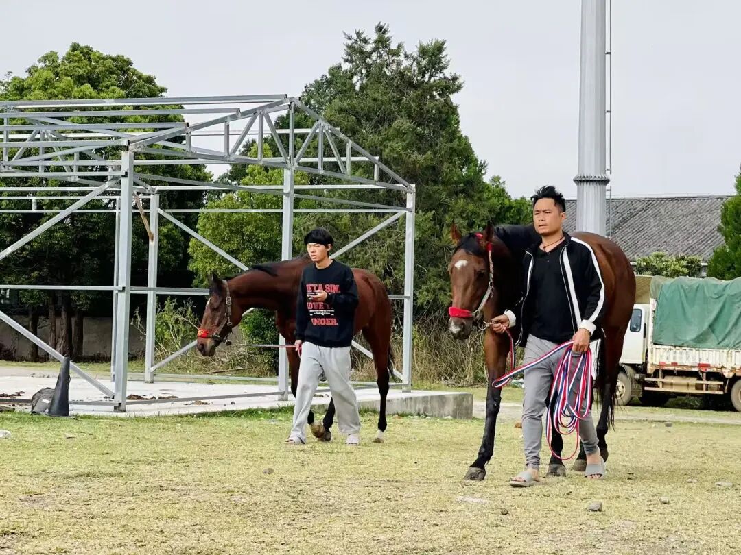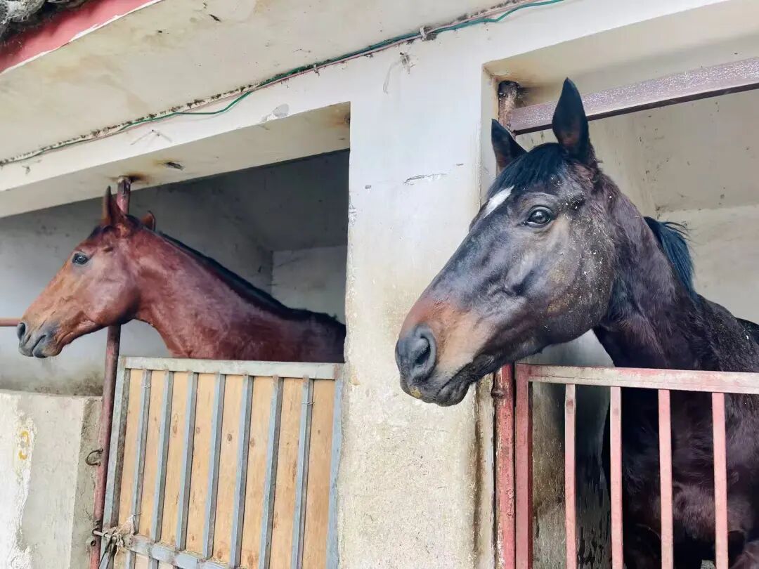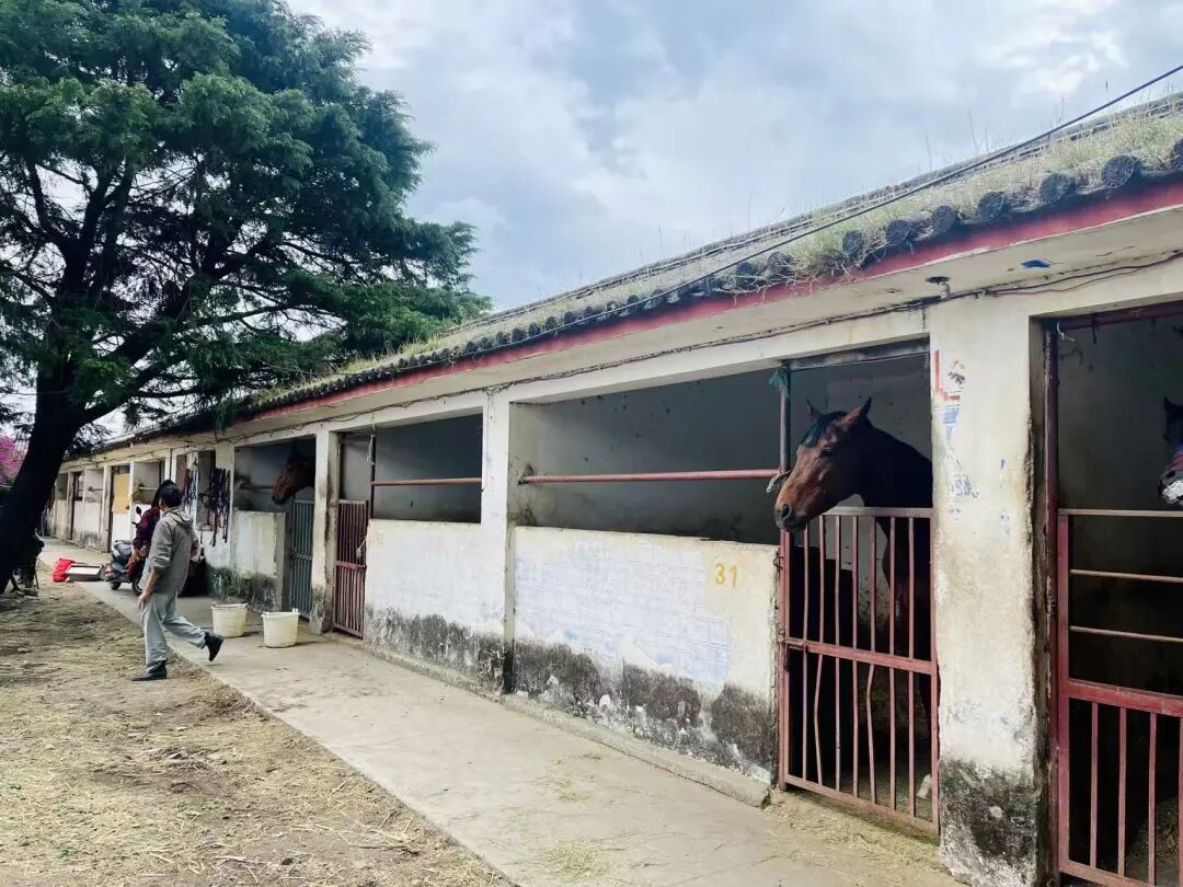 赛马场外围的马厩区被打理得井井有条。有的马匹正低头安静地咀嚼草料,有的则探出头来好奇地张望来往人群,马队工作人员穿梭其间,忙着给马匹遛弯、洗澡、刷毛、检查蹄铁。