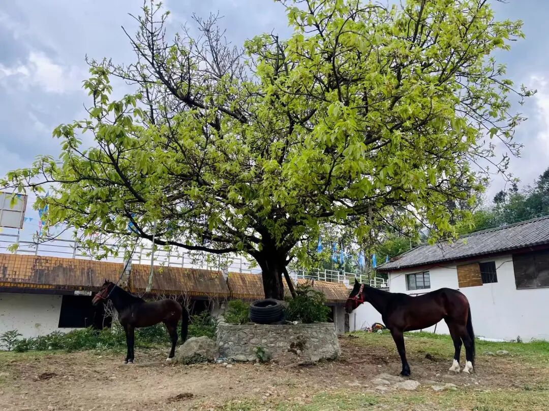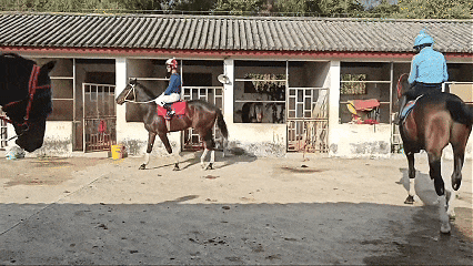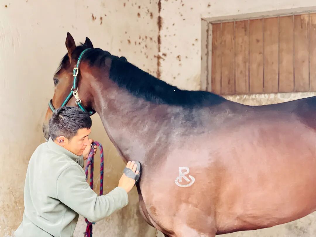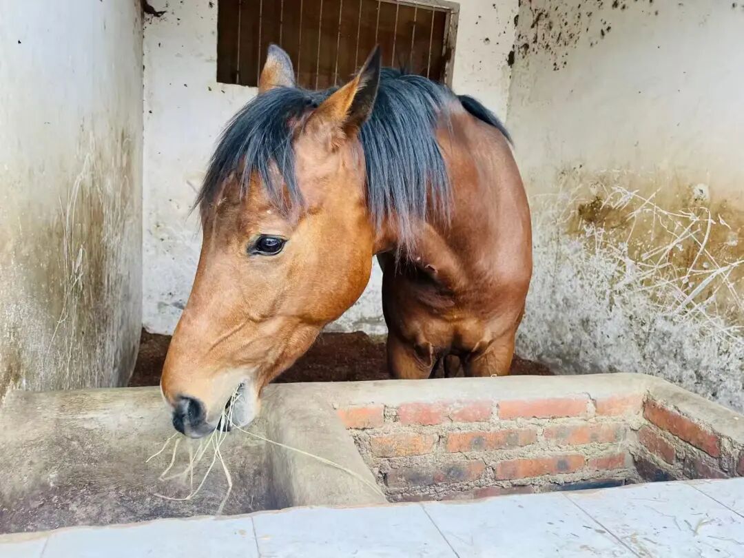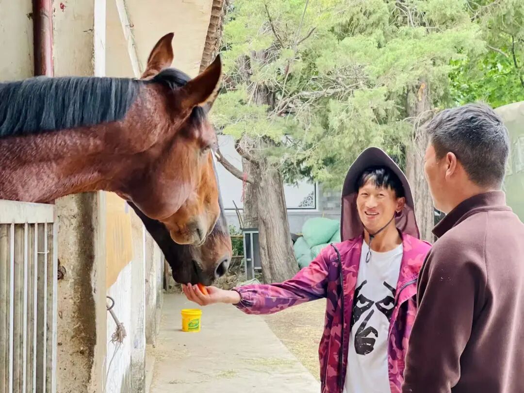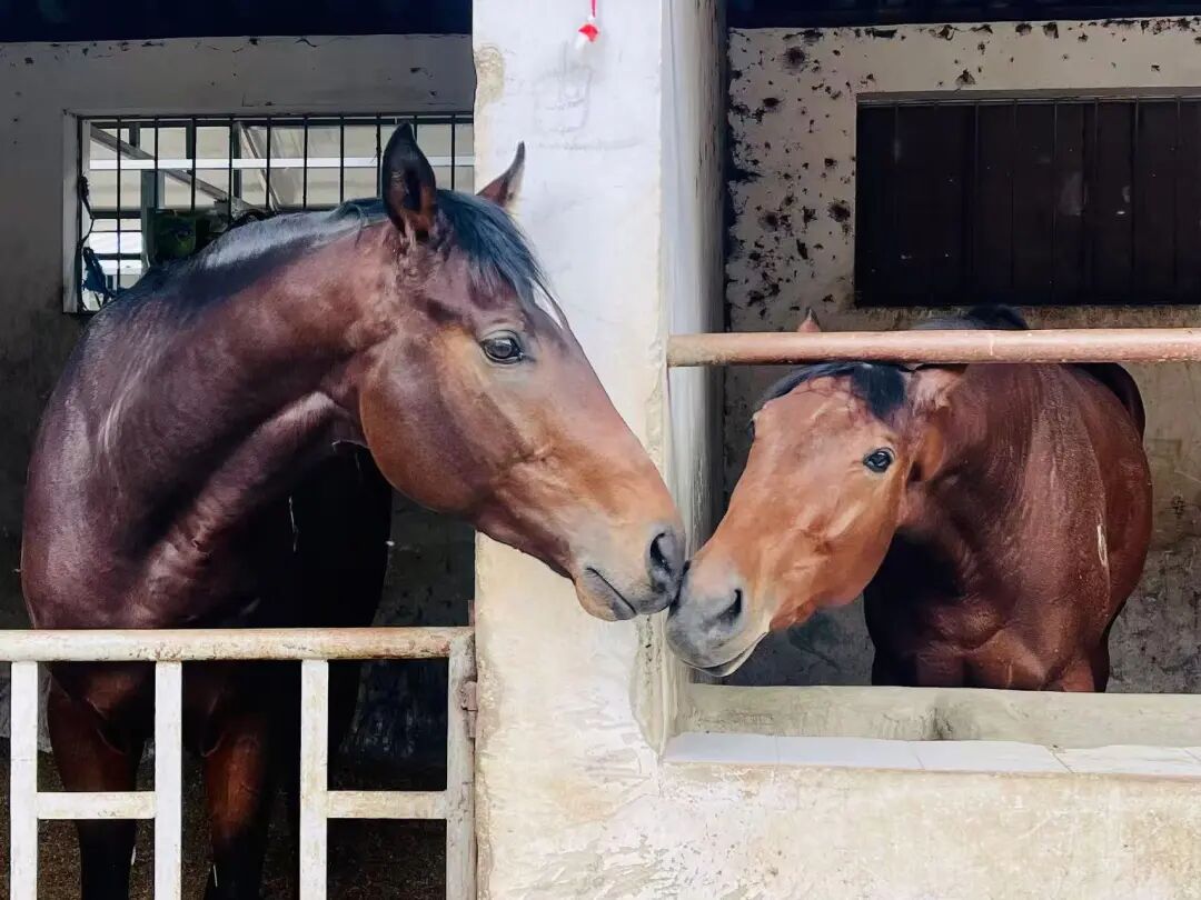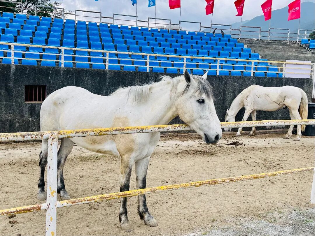 赛马场外围的马厩区被打理得井井有条。有的马匹正低头安静地咀嚼草料,有的则探出头来好奇地张望来往人群,马队工作人员穿梭其间,忙着给马匹遛弯、洗澡、刷毛、检查蹄铁。