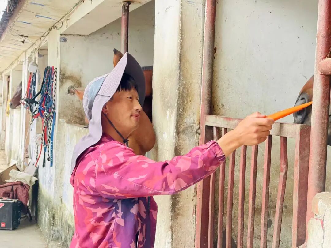 大理州马术协会的年轻骑手余星今年是第三次参加三月街赛马大会,他一边给马喂胡萝卜一边说:“这两天我和马一直在训练,配合得挺好,马儿状态也不错。去年1000米拿了冠军,5000米拿了第五名,今年再接再厉,争取再拿一个冠军!”说着,他拍了拍身旁的搭档,马儿打了个响鼻,像是听懂了主人的话。