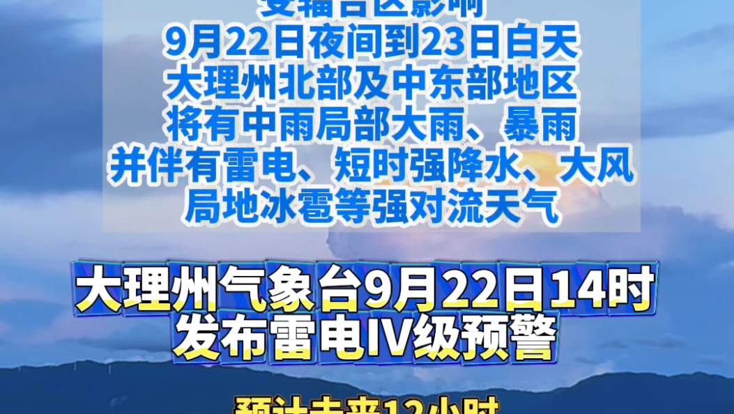 雷电IV级预警!9月22日夜间到23日白天,大理将有强降雨→#大理#天气预报