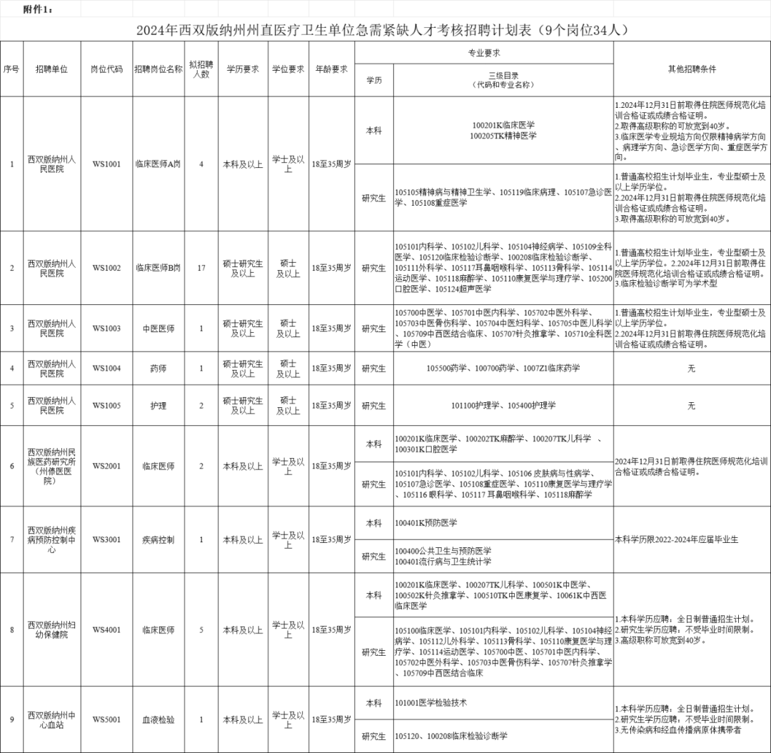 西双版纳州州直医疗卫生单位2024年急需紧缺人才考核招聘(校园招聘)通告