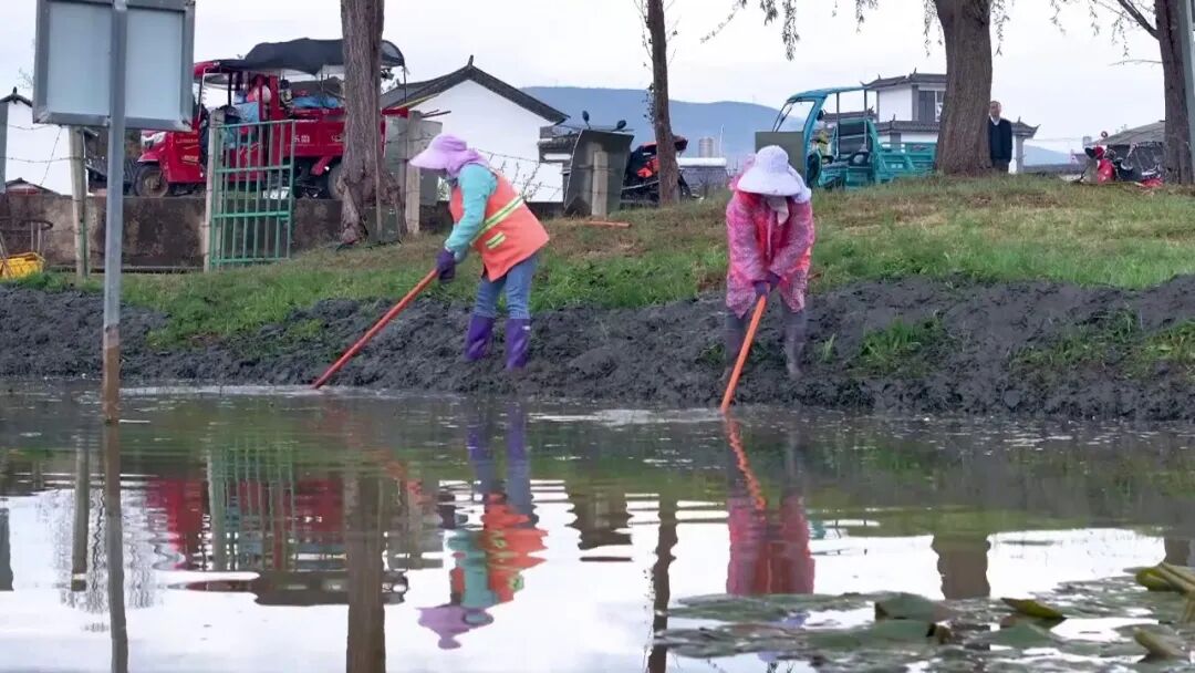 3月27日上午,在位于洱海源头的洱源县茈碧湖镇,管护人员正在清理库塘内的淤泥、枯枝败叶和水草。