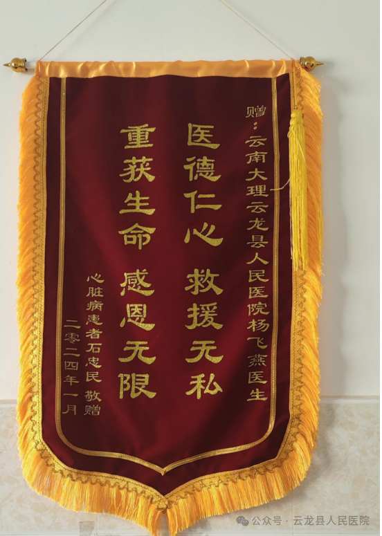 1月19日,云龙县人民医院皮肤科医生杨飞燕在北京飞往大理的飞机上,遇到一名疑似“急性心绞痛”的患者,患者面色苍白、生命垂危。在紧急情况下,杨飞燕医生挺身而出,利用自己的医疗专业知识对患者实施了紧急救治,为患者后续抢救赢得了宝贵的时机。3月22日,患者康复出院后,通过航空公司查询到了杨飞燕医生的信息,寄来了一面锦旗。杨飞燕医生作为医者的专业素养和仁心大爱,在关键时刻勇于担当、见义勇为的高尚品质,让她收获了这面锦旗。这面锦旗不仅是对她个人的褒奖,也是对医者仁爱精神的肯定。